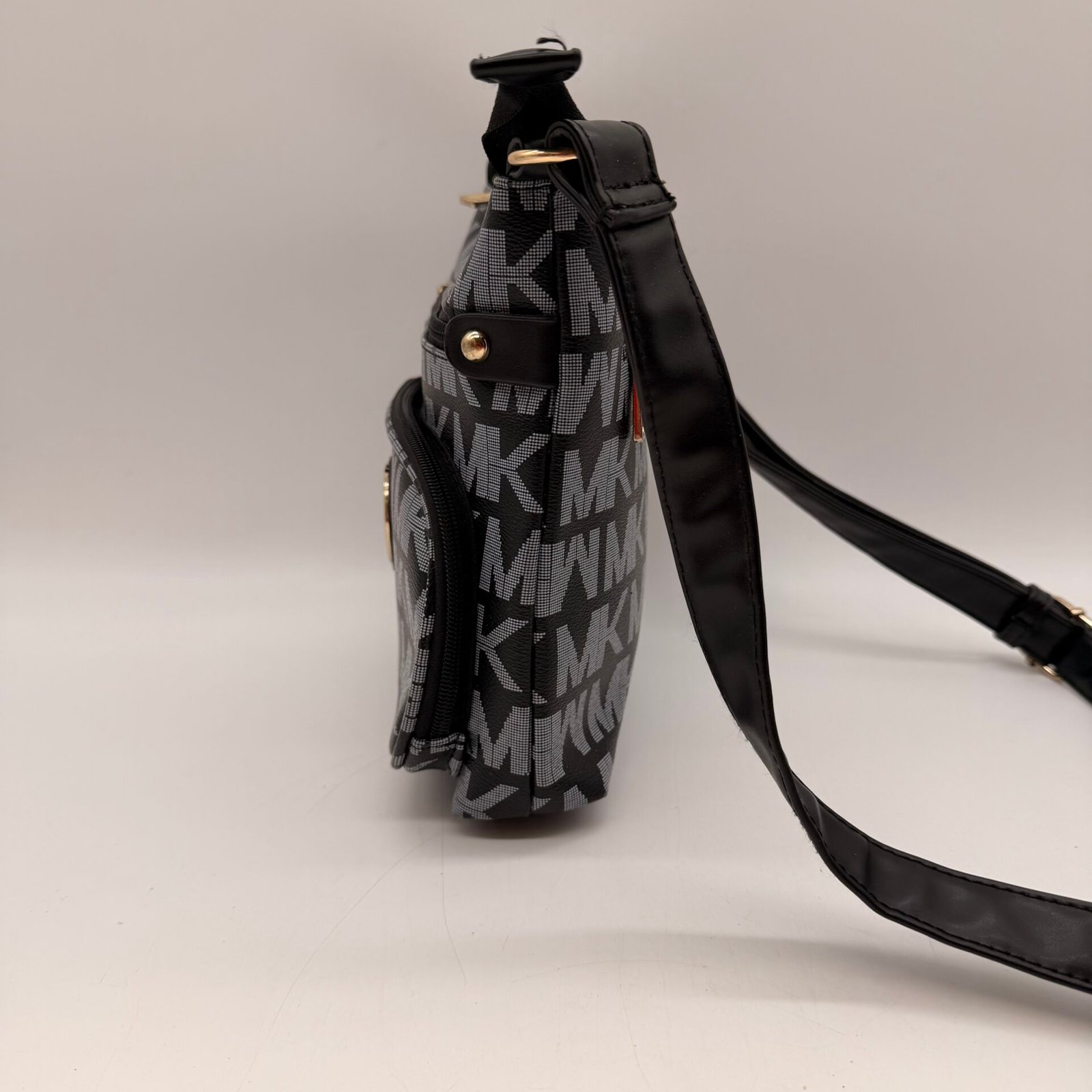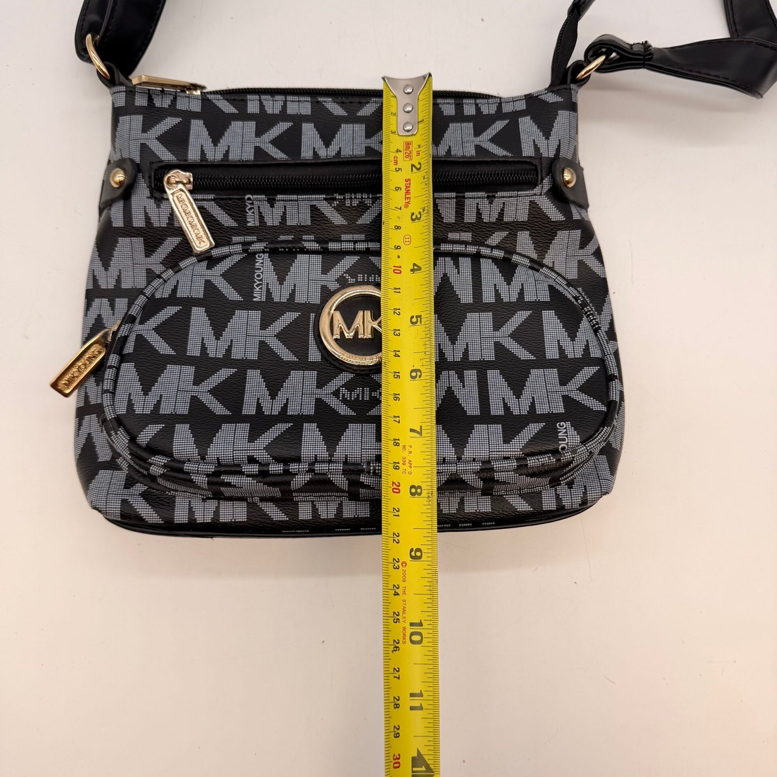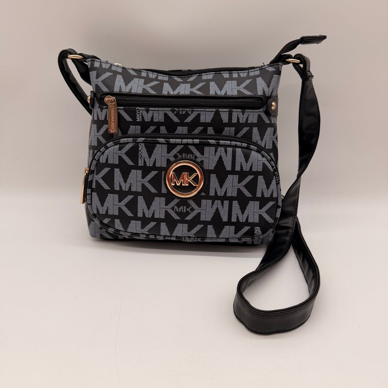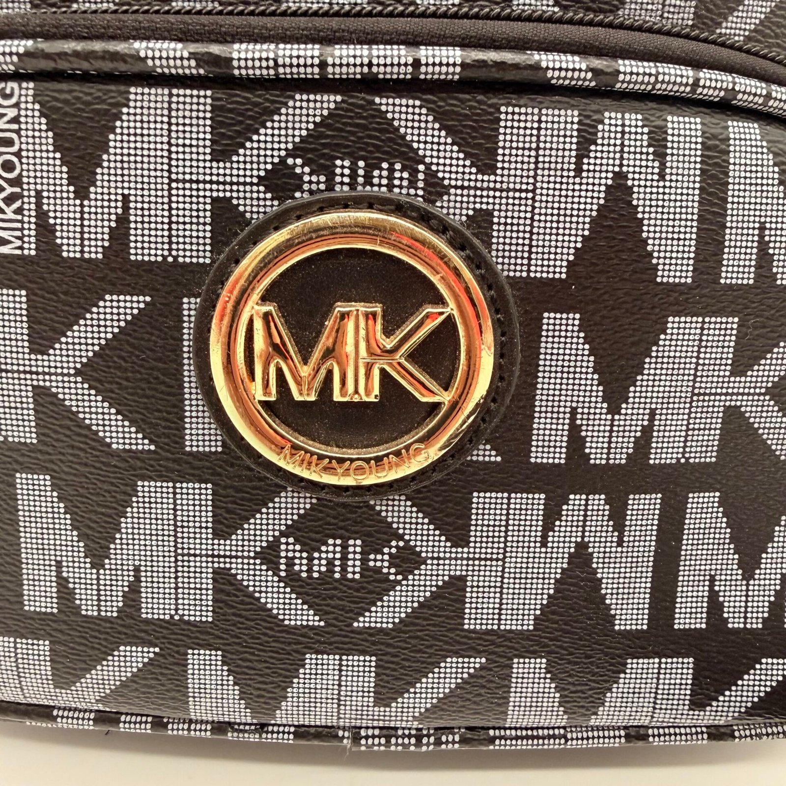 Elegant MKYOUNG crossbody shoulder bag featuring a stylish black and grey MK logo pattern.