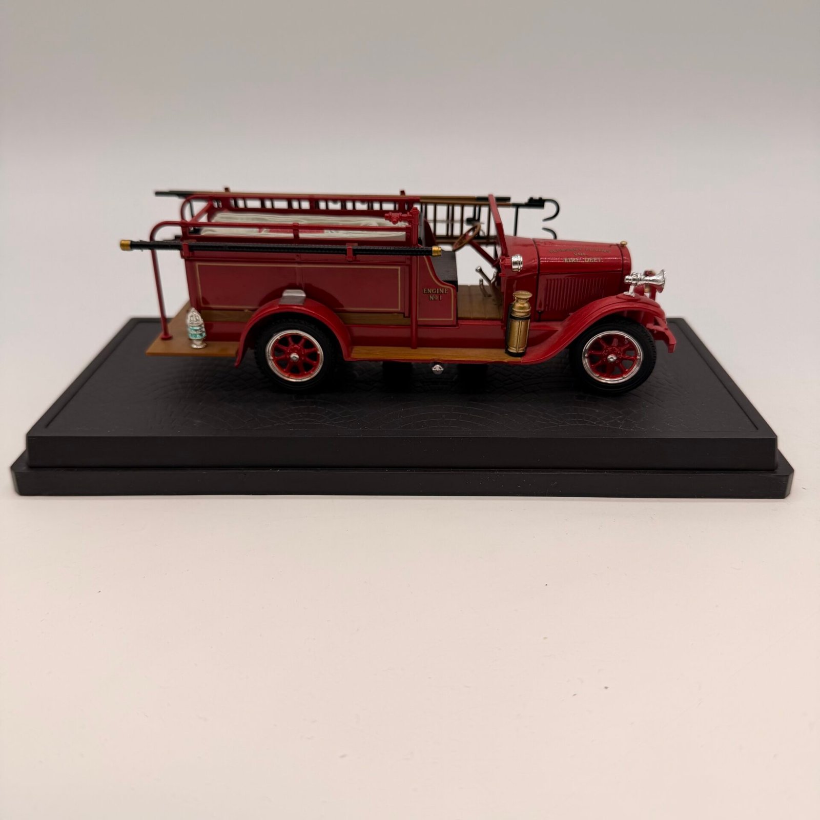 This vintage-style fire engine features excellent detailing including ladders, hose, side equipment, and interior elements. Mounted on a display base with model name.
