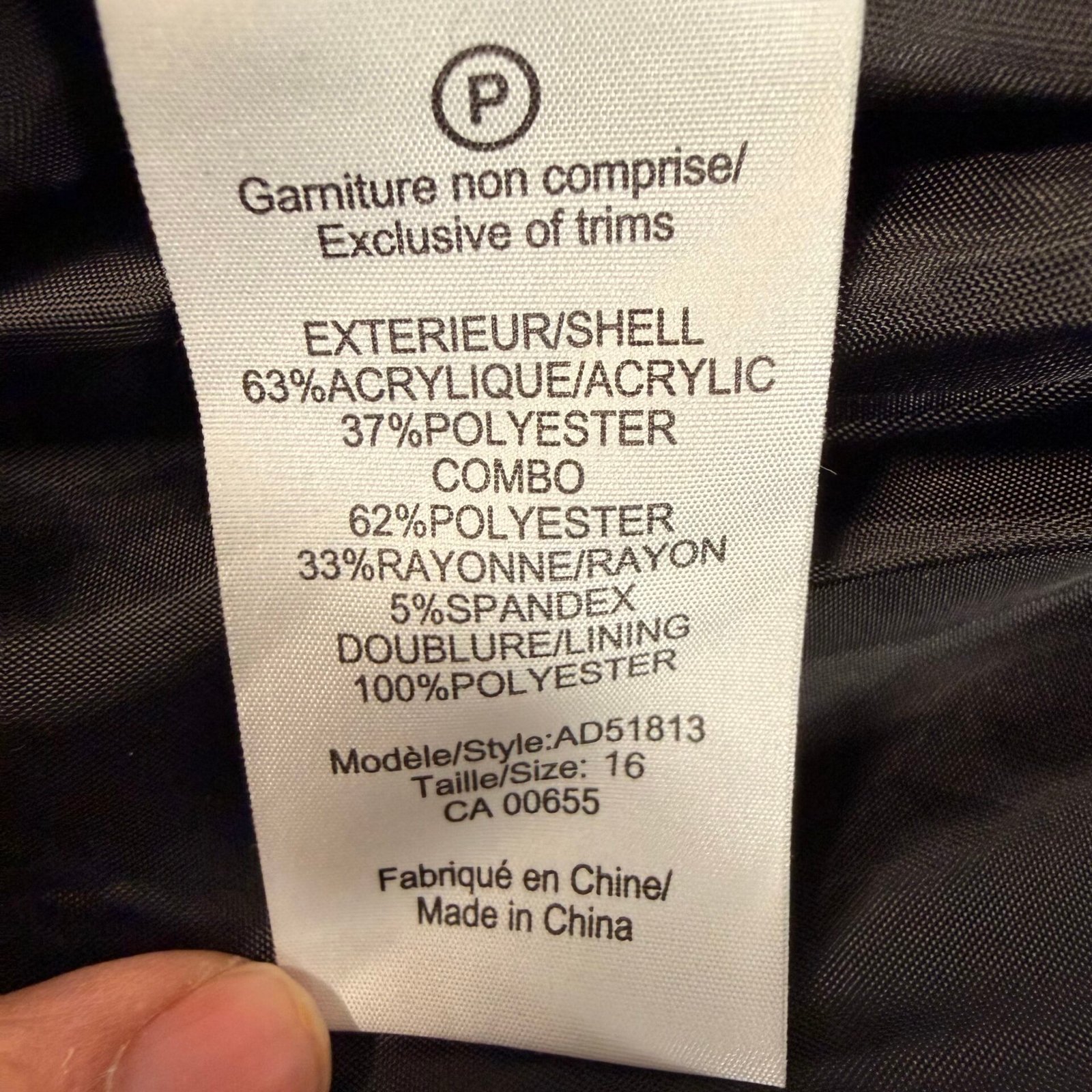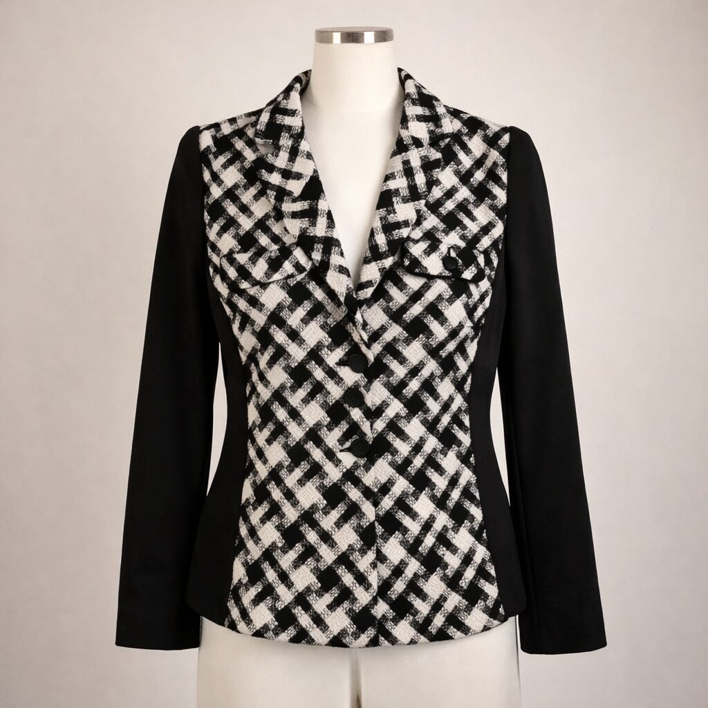 Features a modern black and white textured front with solid black sleeves and back. Fully lined with comfortable stretch.