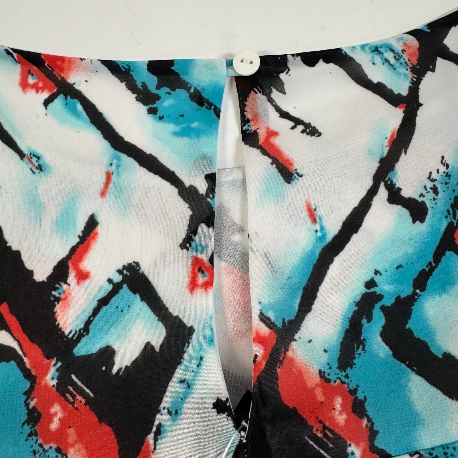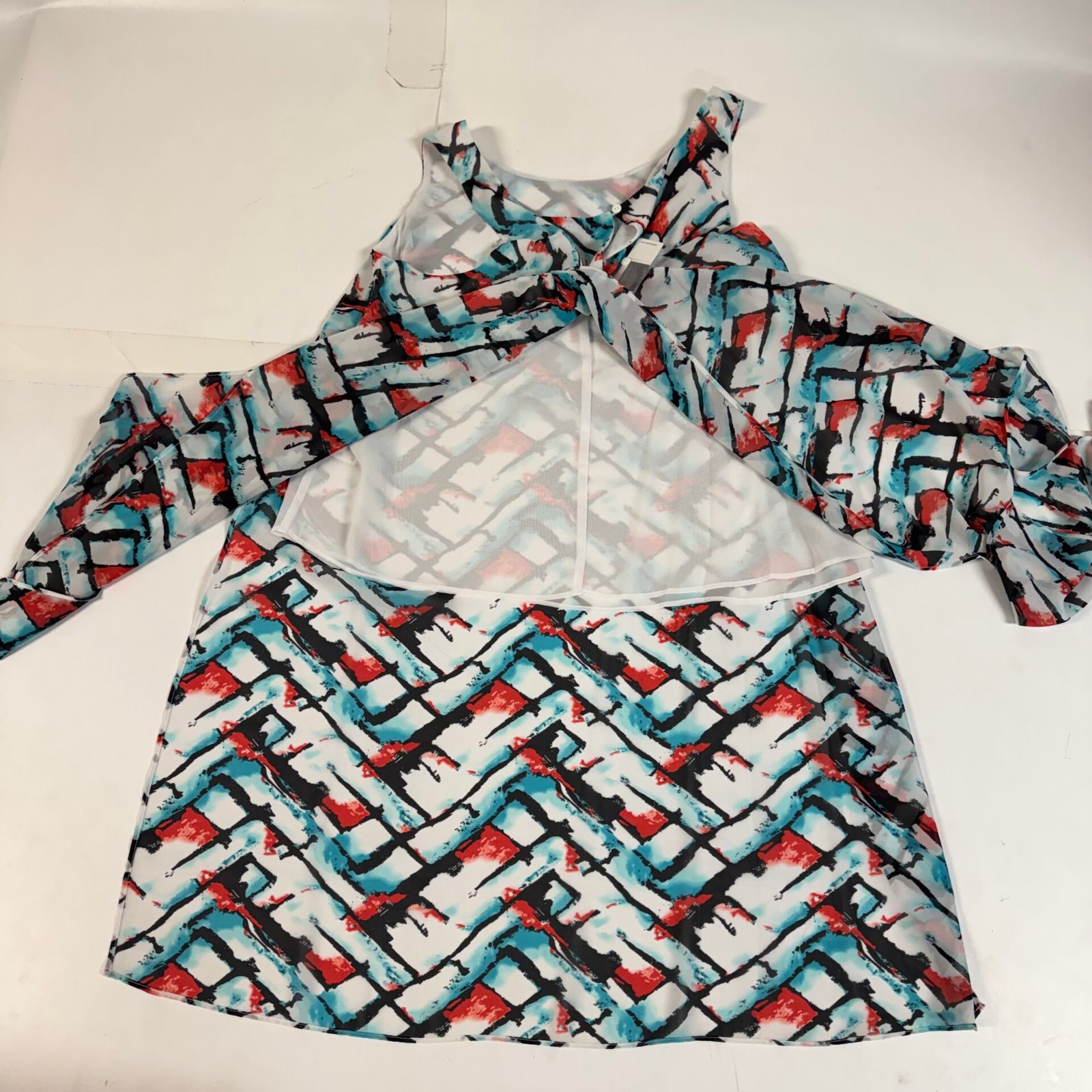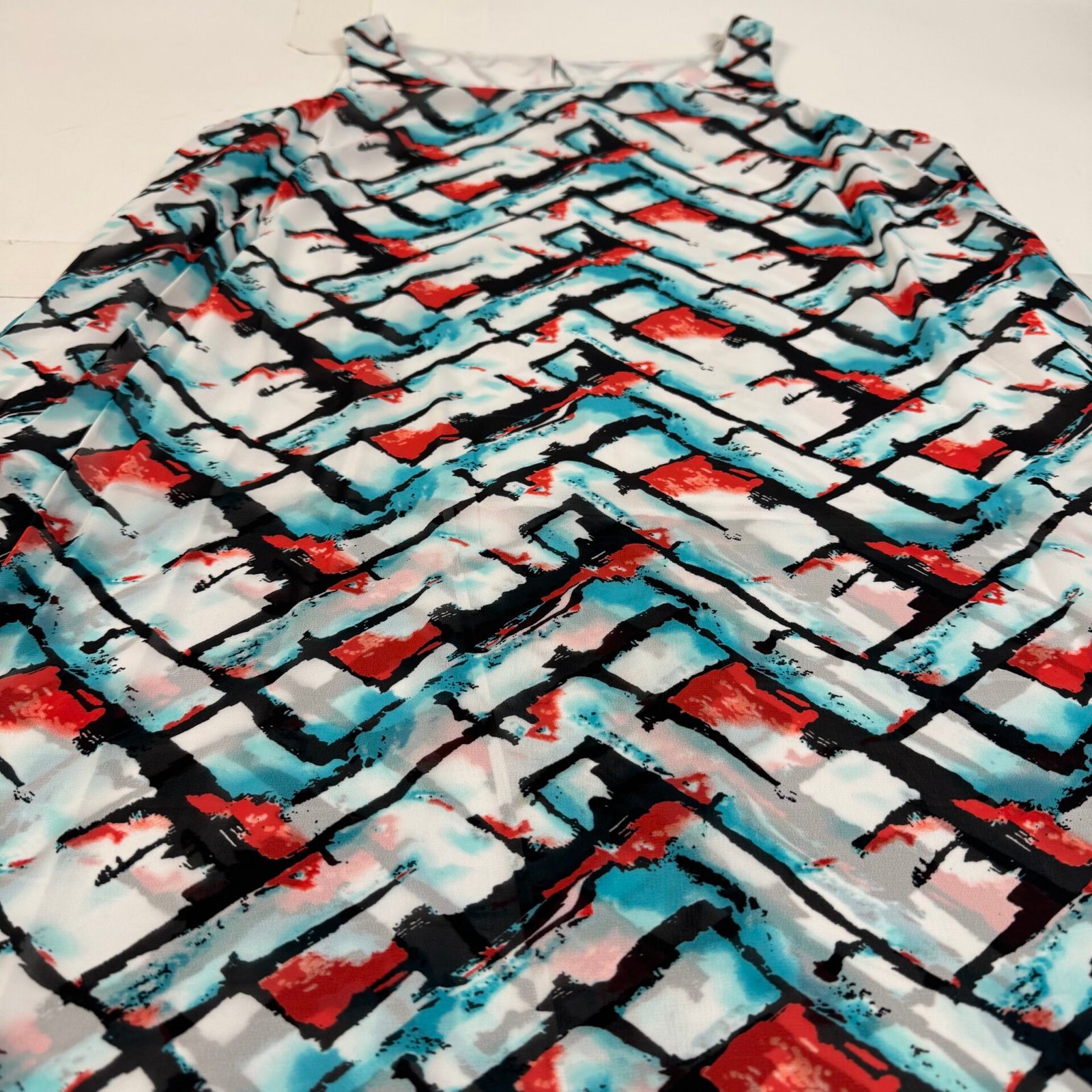 Beautiful Addition Elle sleeveless shift dress featuring a bold abstract print in red, aqua, black and white tones. Lightweight chiffon-style shell with full polyester lining. Back slit with button closure.