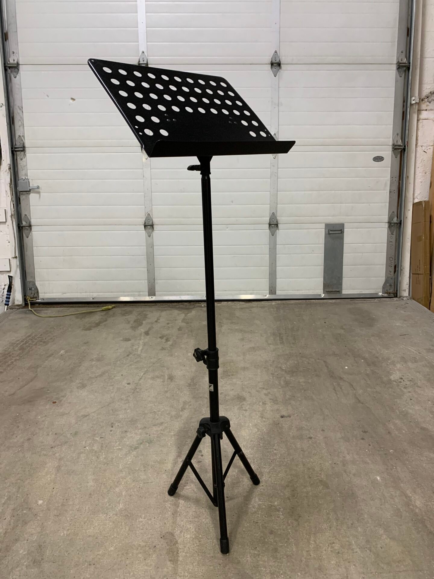 Minimalist black metal music stand with adjustable height and tilting desk.