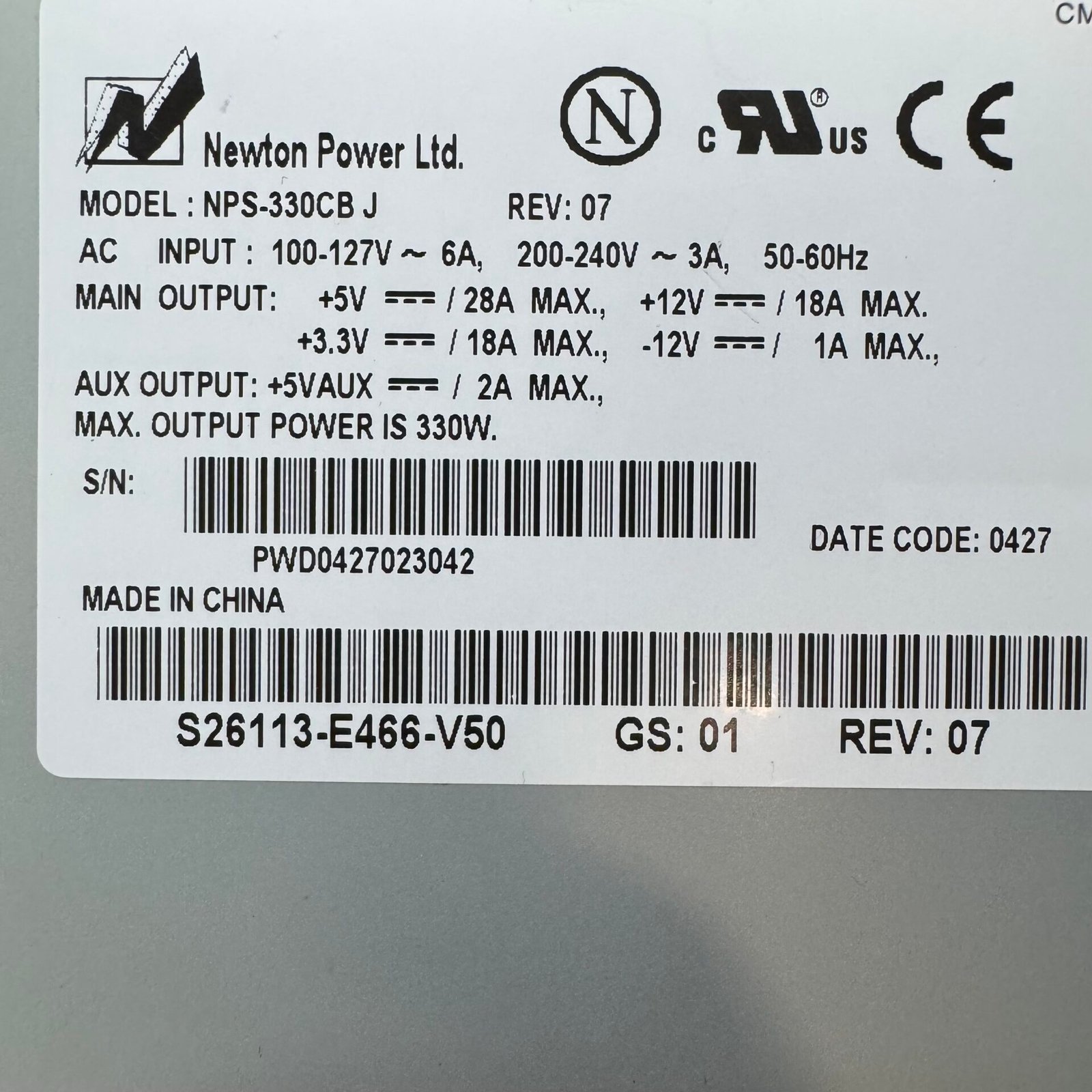 This is a genuine Fujitsu 330W power supply, part number S26113-E466-V50, manufactured by Newton Power (Model: NPS-330CB J, Rev 07). The unit was removed from a working Fujitsu system and has been inspected, cleaned, and verified for stable output. All connectors are included exactly as shown.