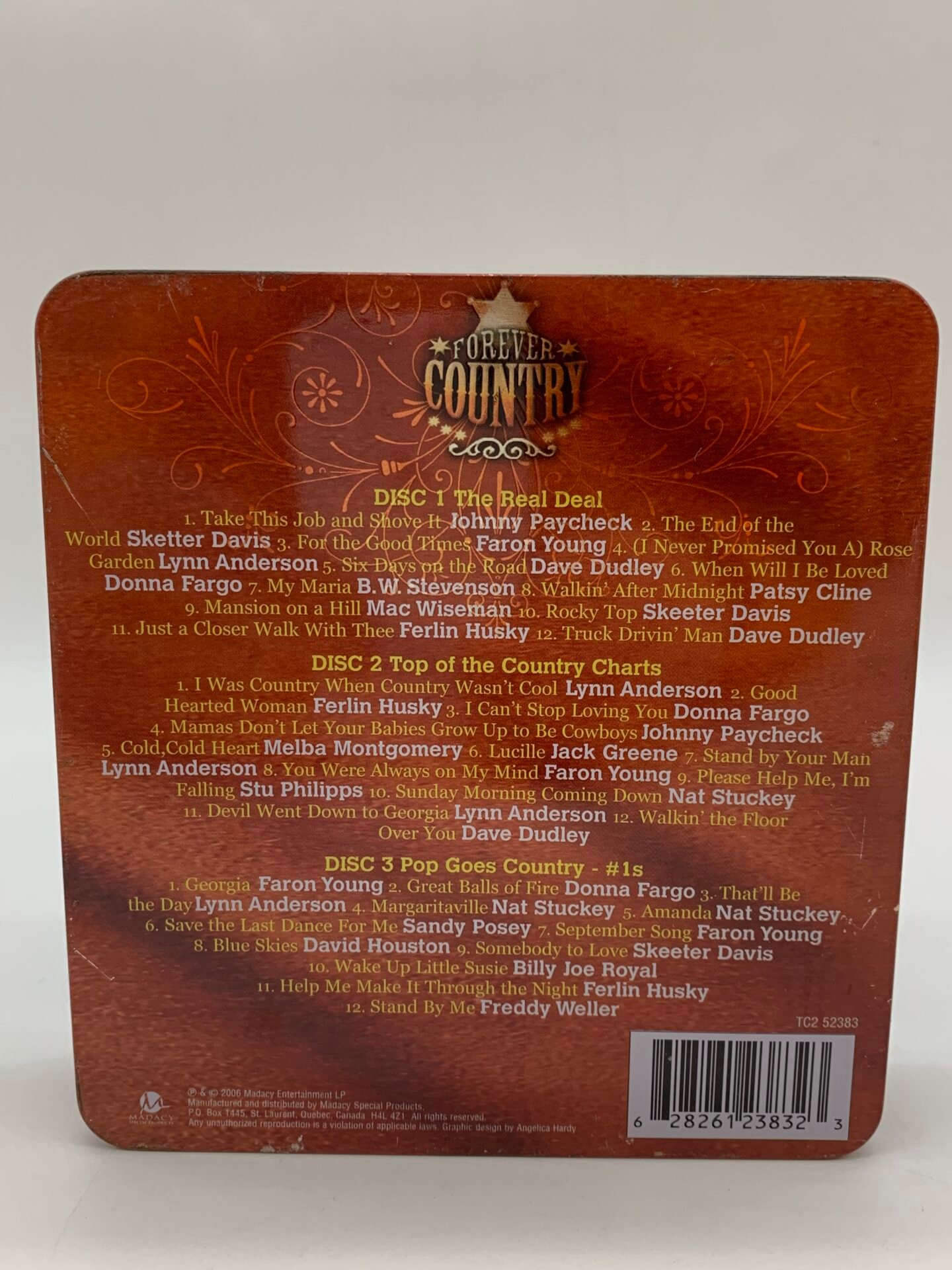 Complete 3-disc country music set in collectible metal tin case.
