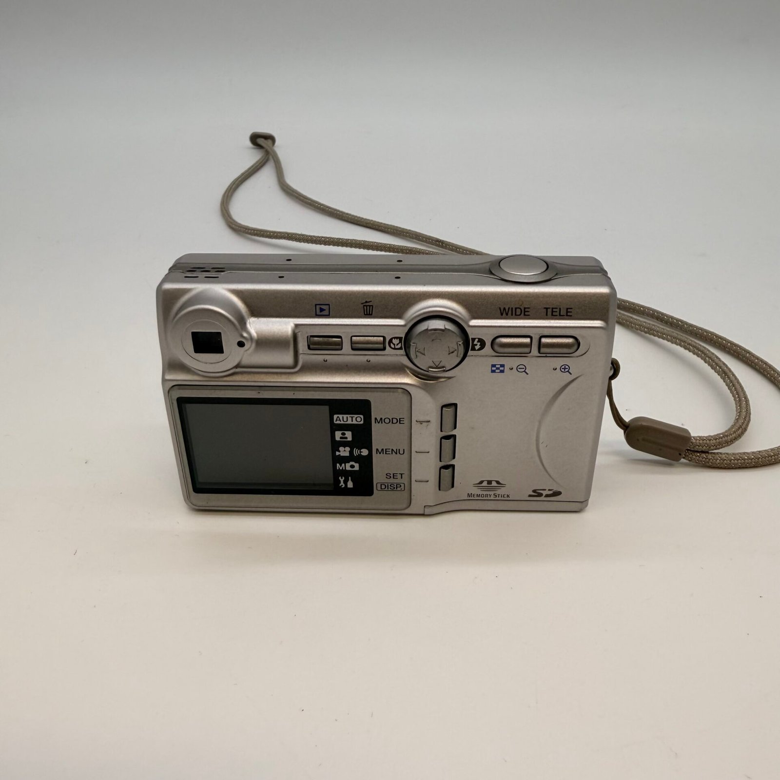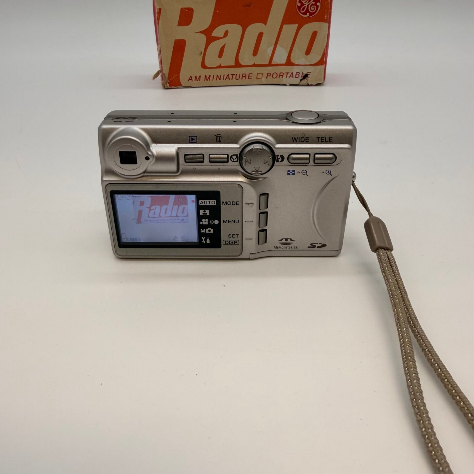 The camera powers on as shown in the photos, and the lens extends. Includes the camera, battery, 128MB Kingston SD card, and wrist strap.
