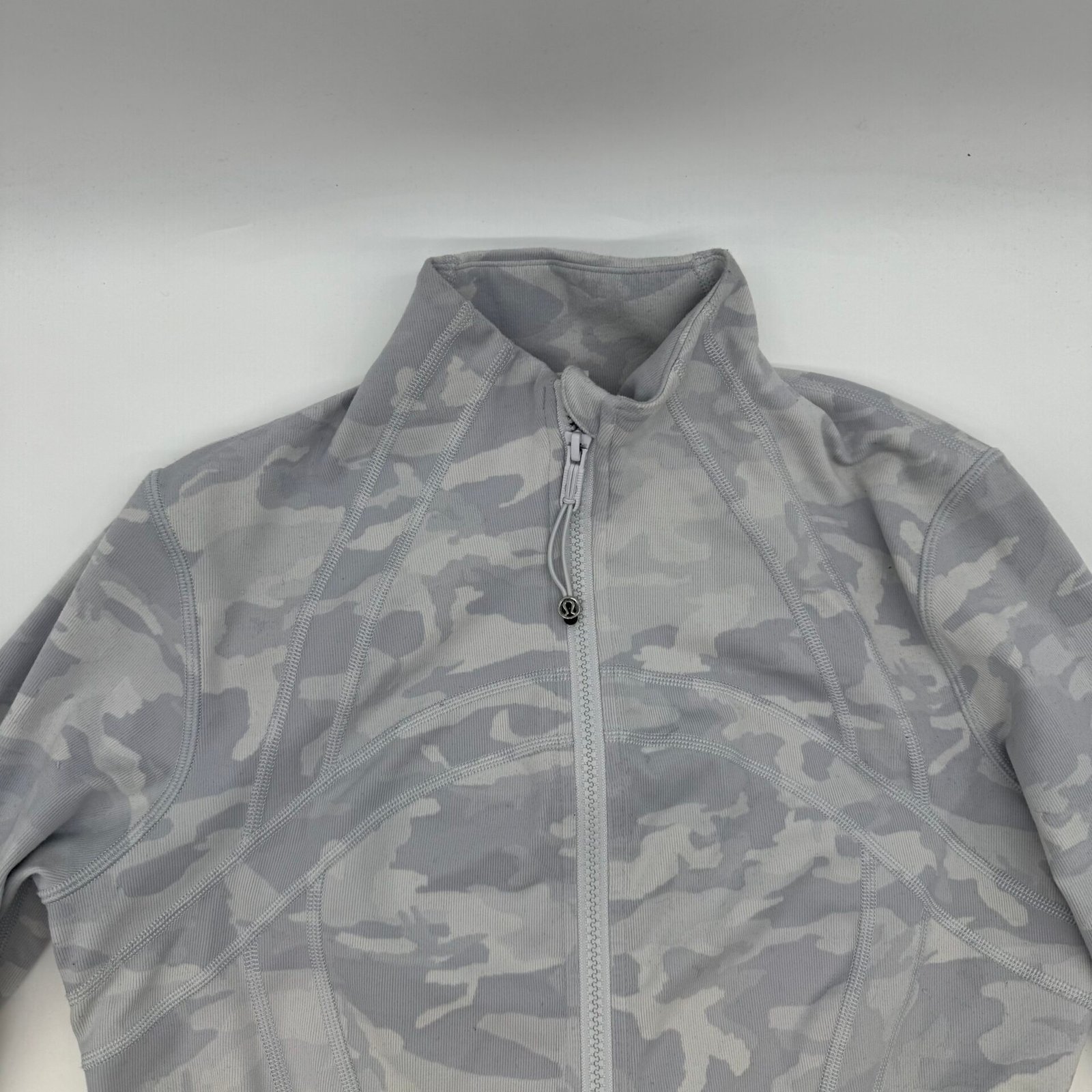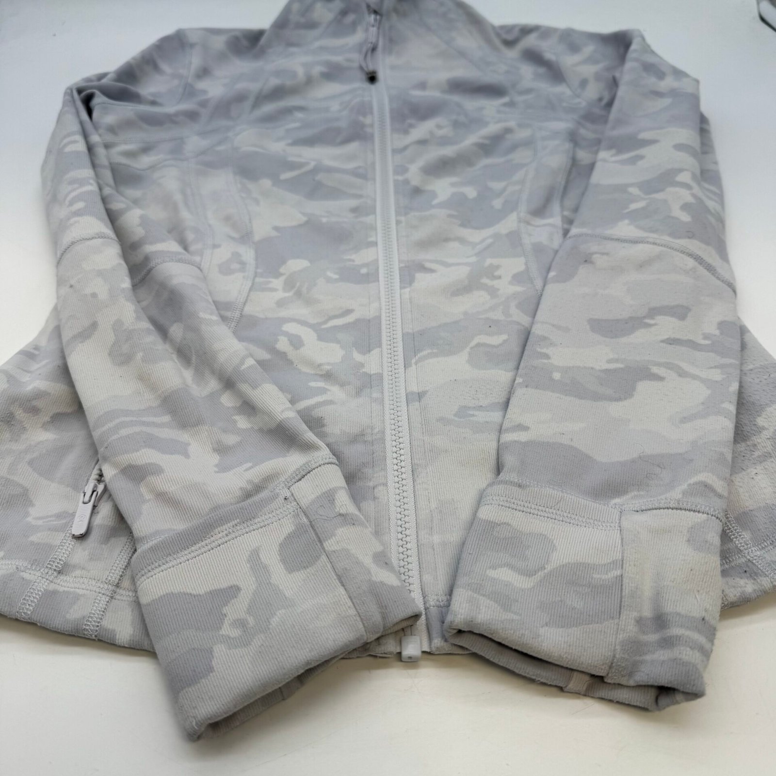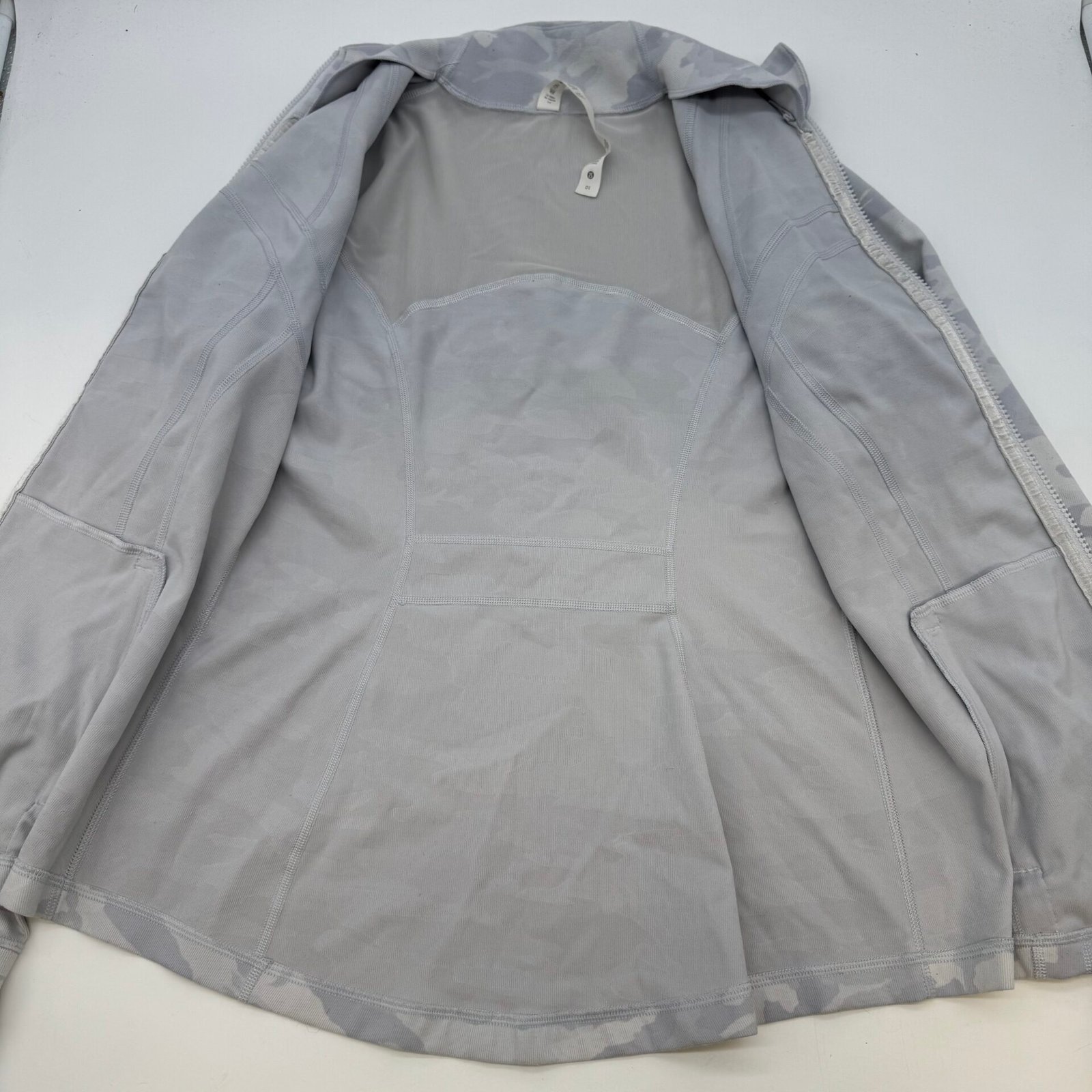 Authentic Lululemon women’s full zip jacket in grey camouflage pattern.