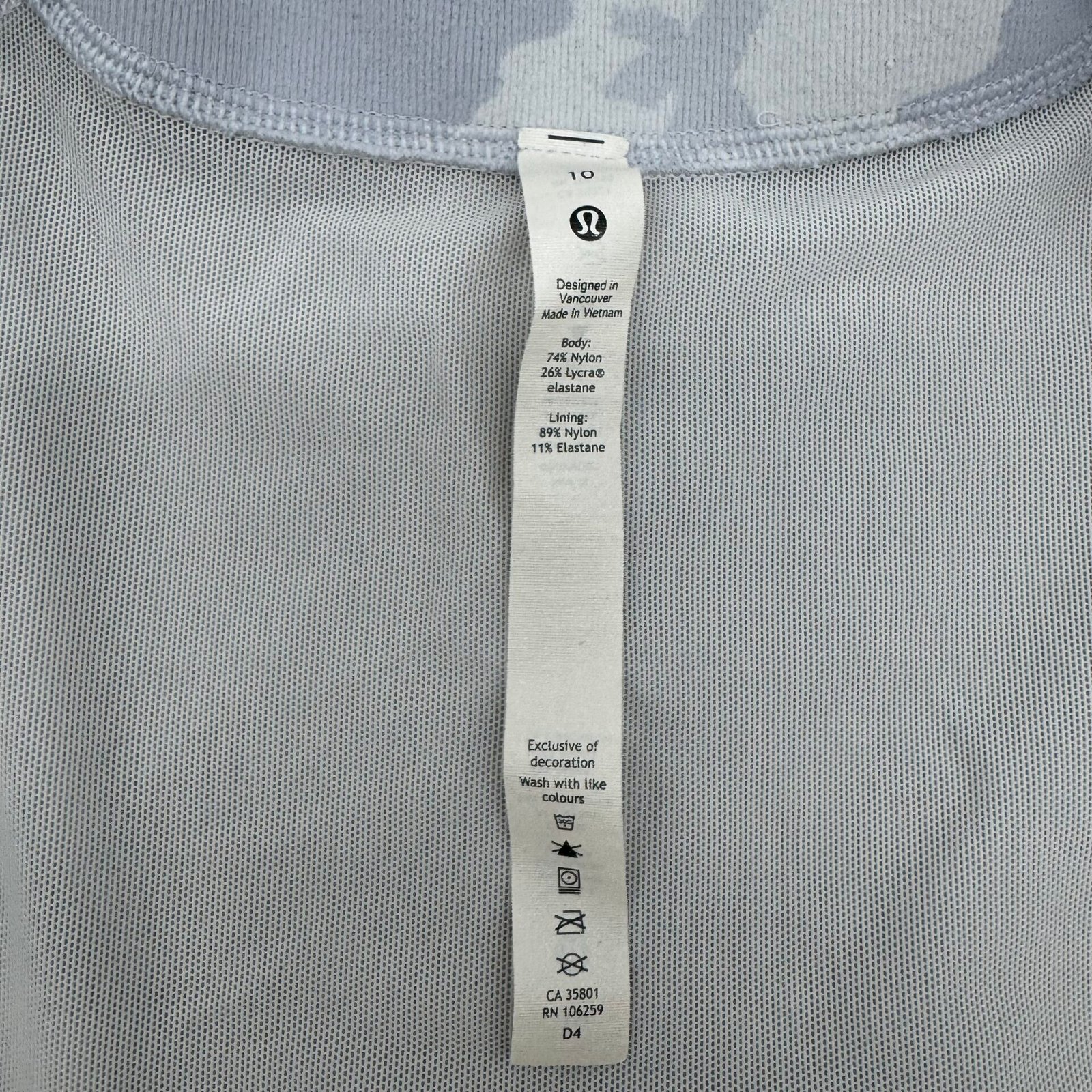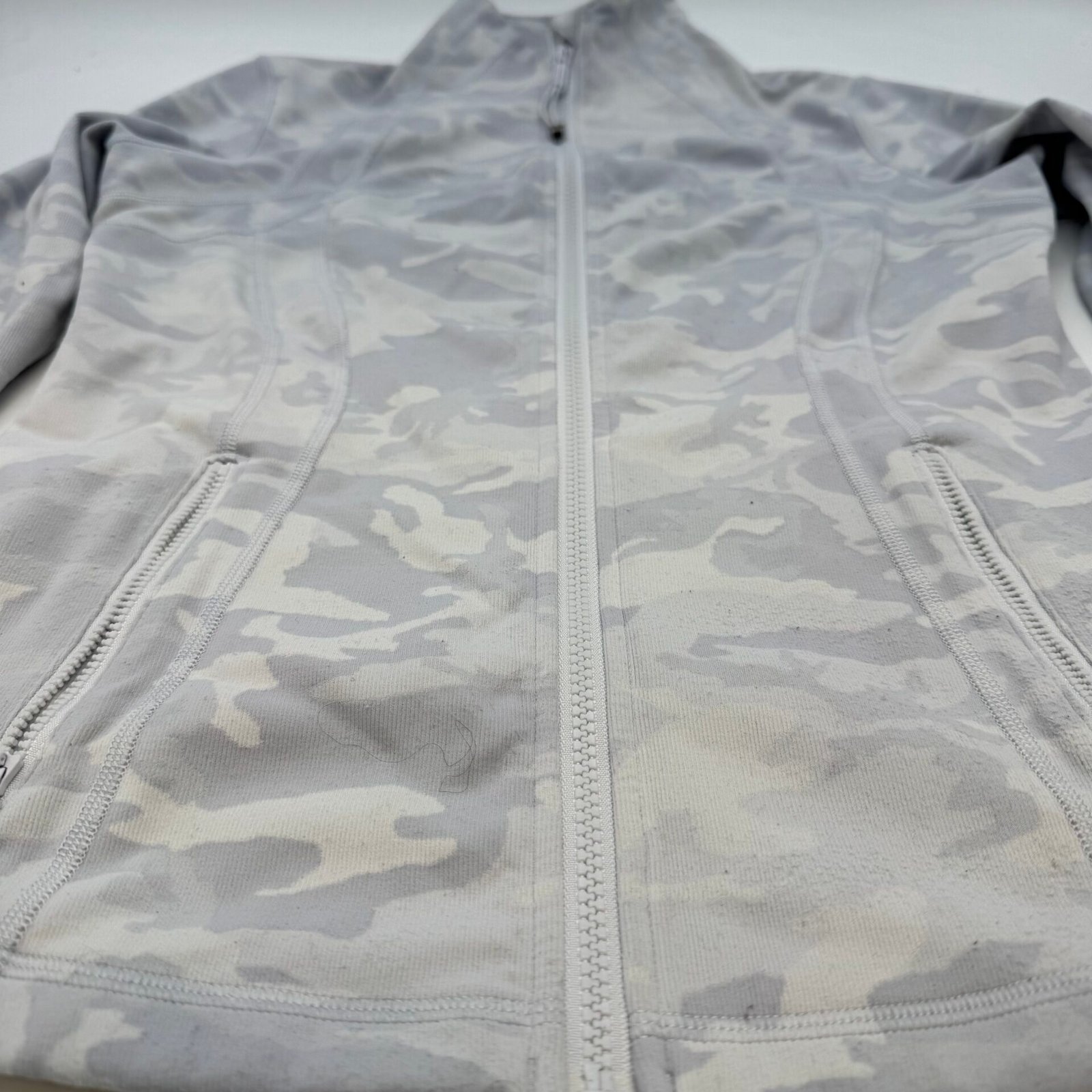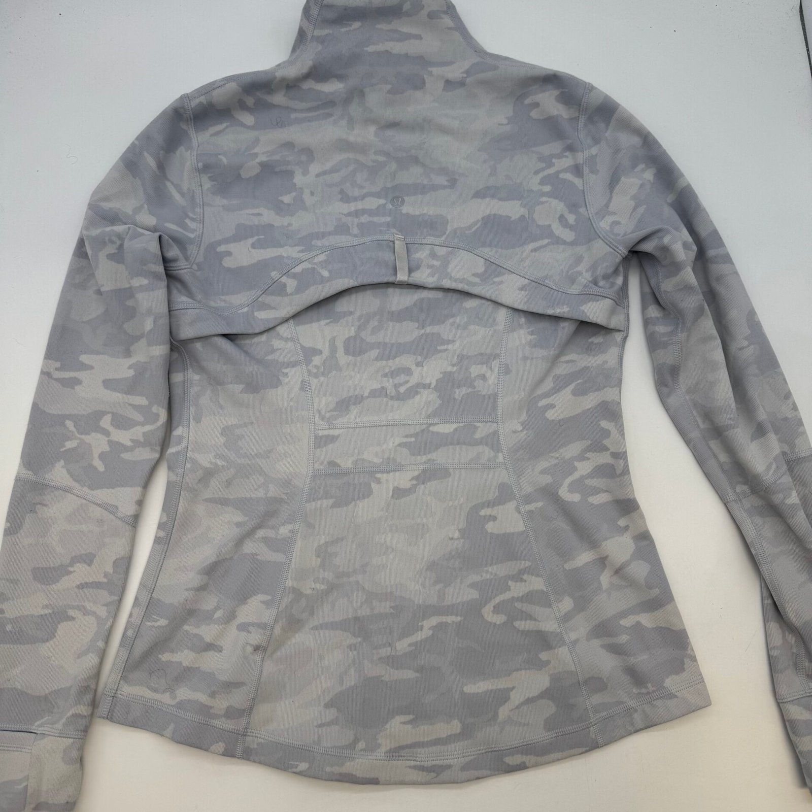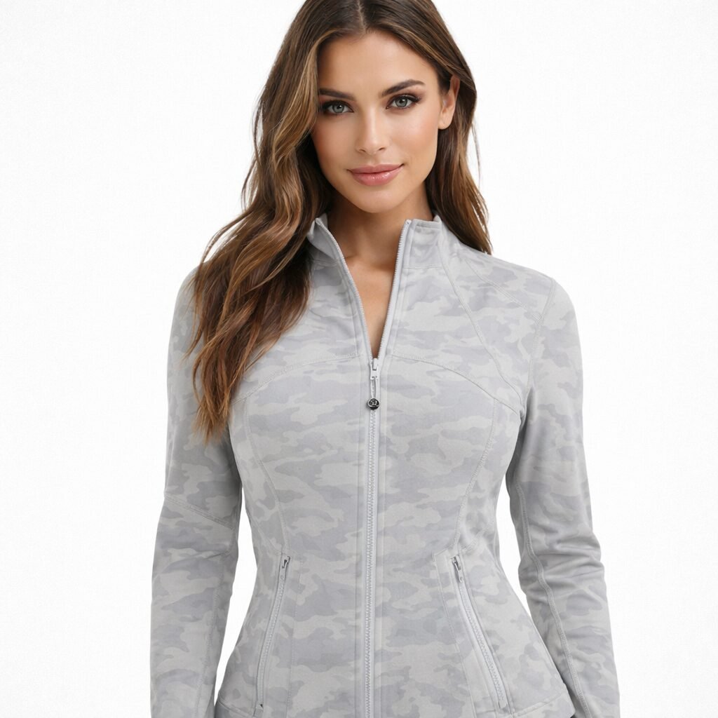 Authentic Lululemon women’s full zip jacket in grey camouflage pattern.