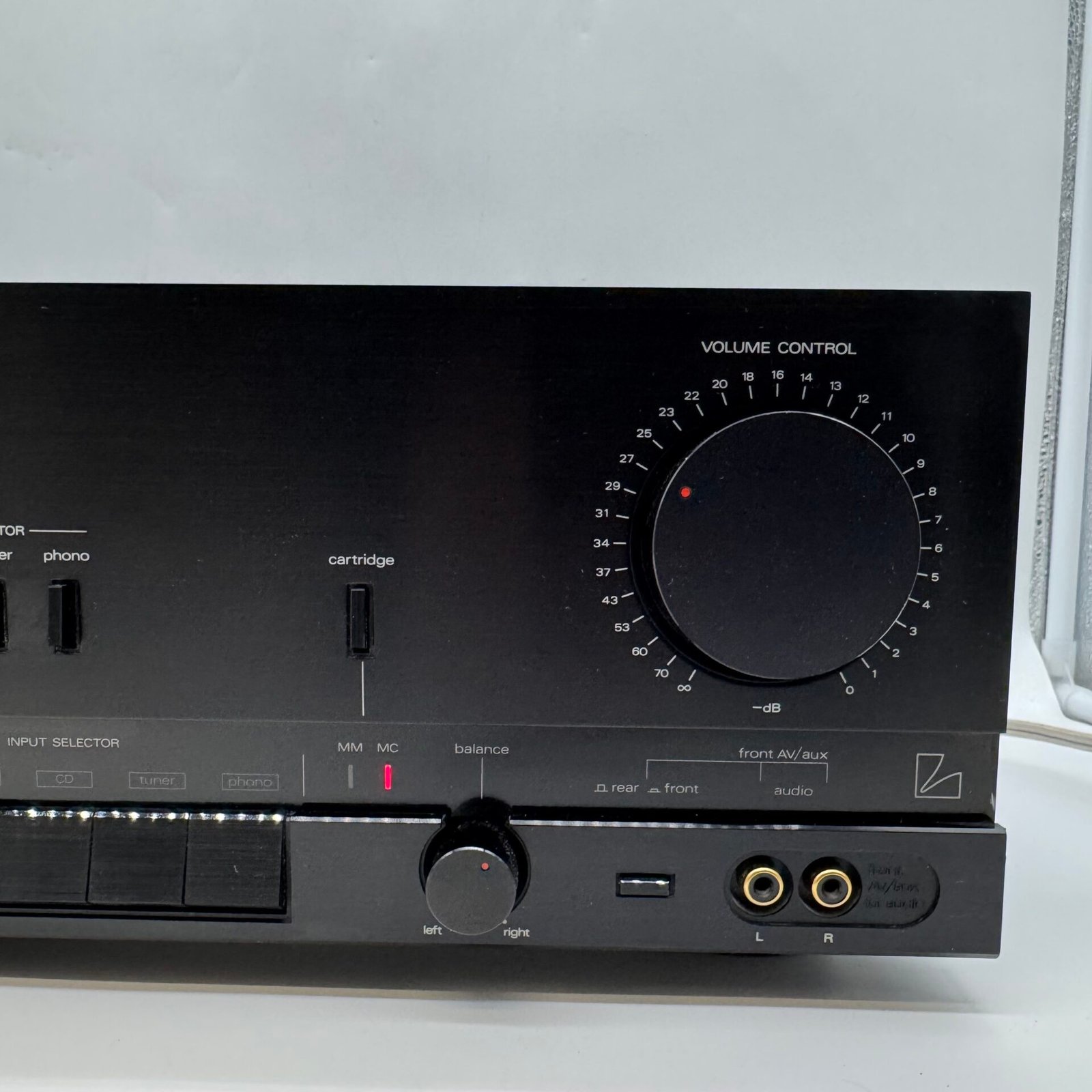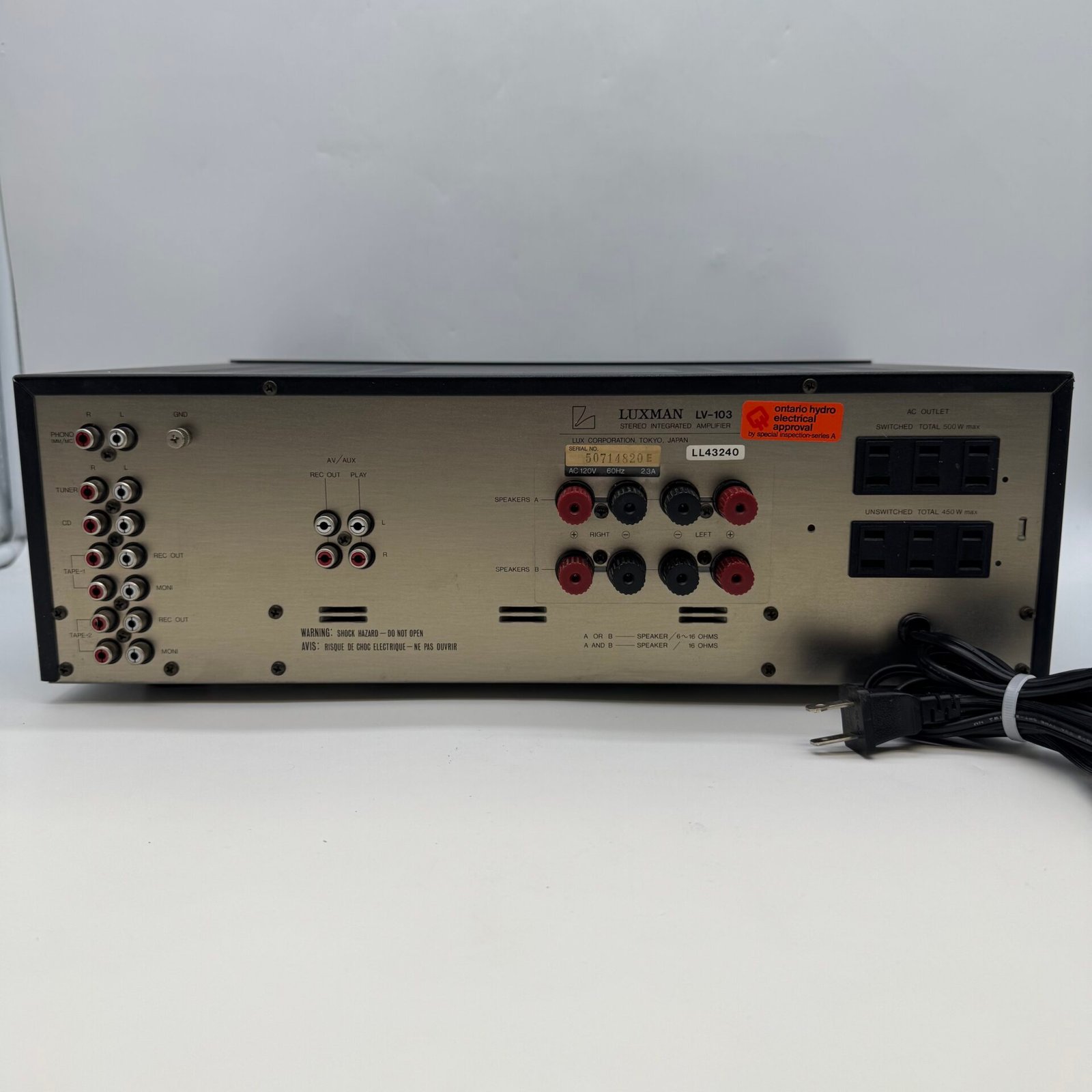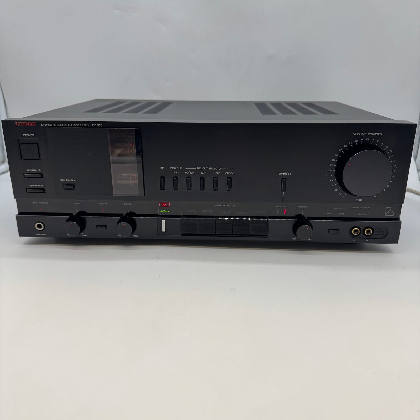 This is a vintage Luxman LV-103 stereo integrated amplifier from the late 1980s. This model is a hybrid tube amplifier, combining vacuum tube warmth with solid-state performance, making it highly desirable among audiophiles.
