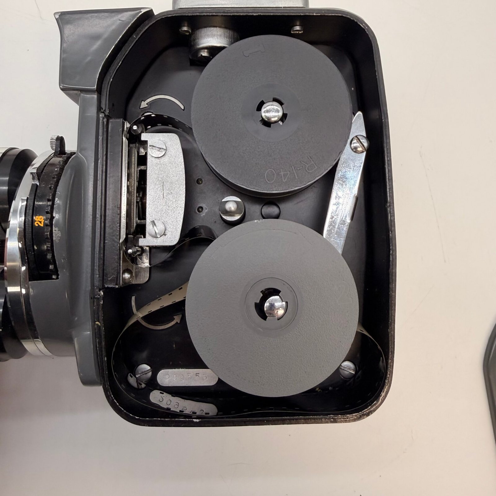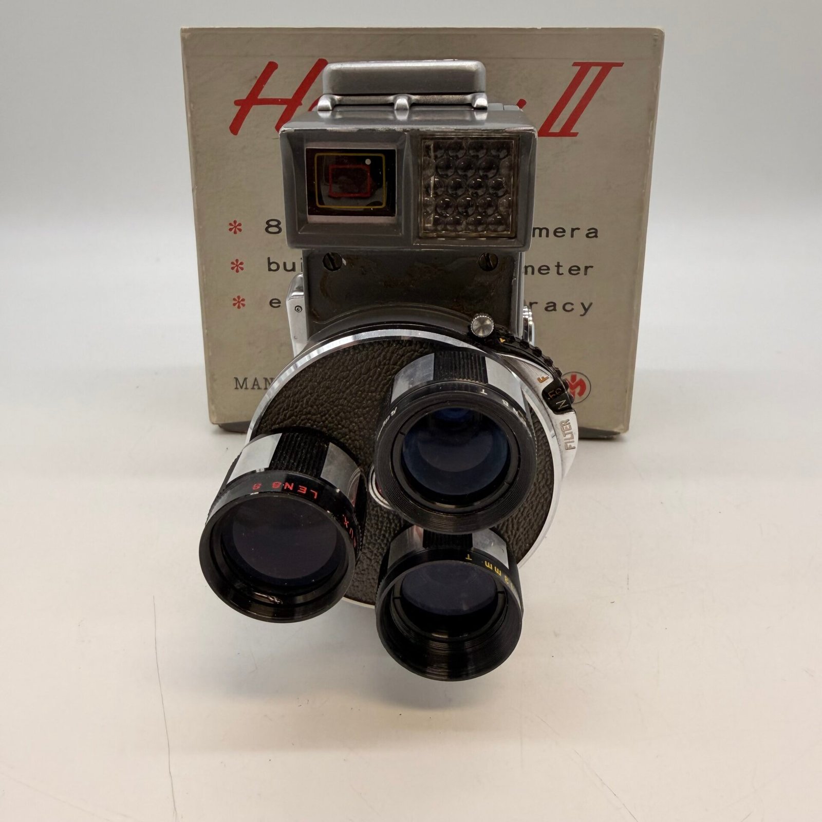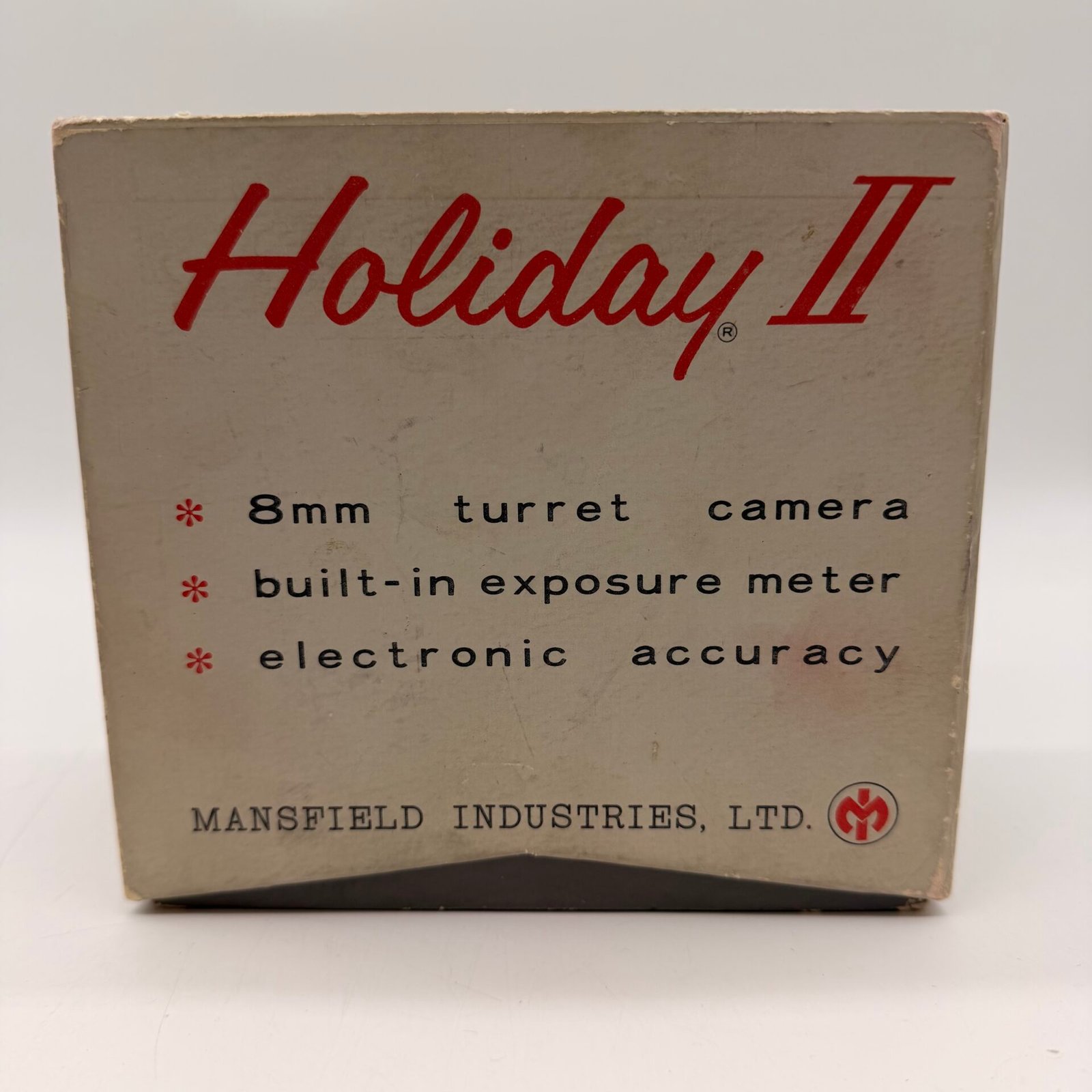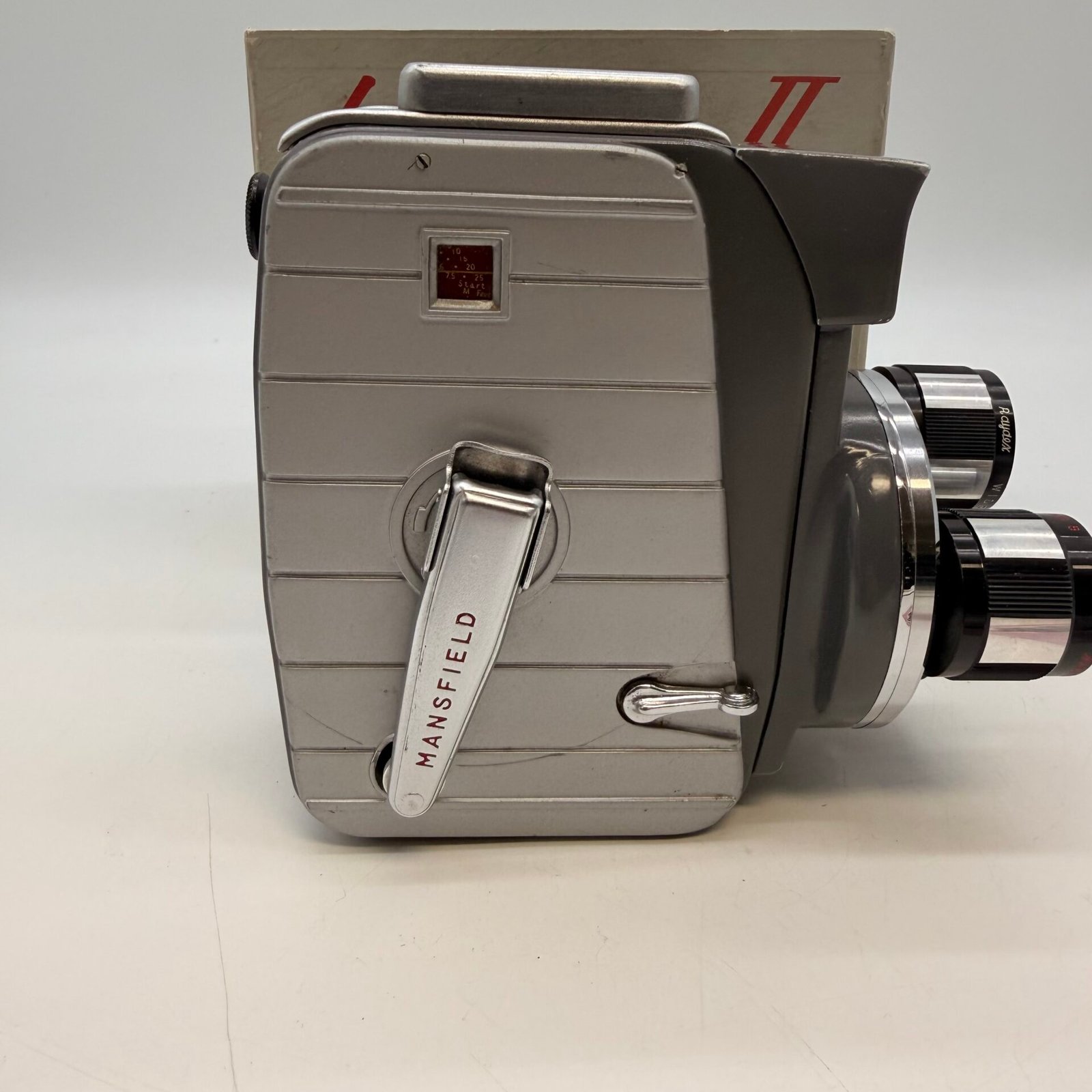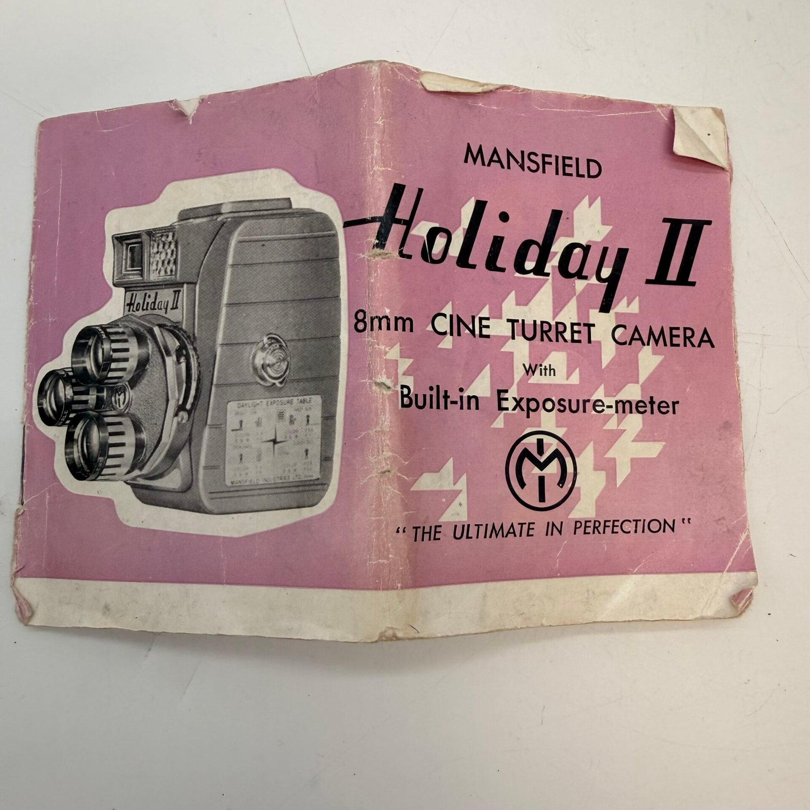 Authentic vintage Mansfield Holiday II 8mm cine camera made in Japan. A classic mid-century film camera featuring turret lenses and built-in exposure meter.