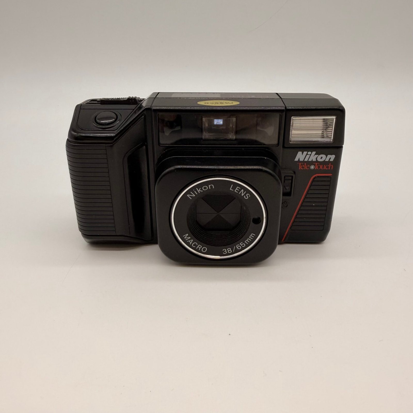 This compact point-and-shoot camera is in good vintage cosmetic condition with light wear from normal use. The camera body presents nicely, and the front markings show Nikon Macro 38/65mm lens. Made in Japan.