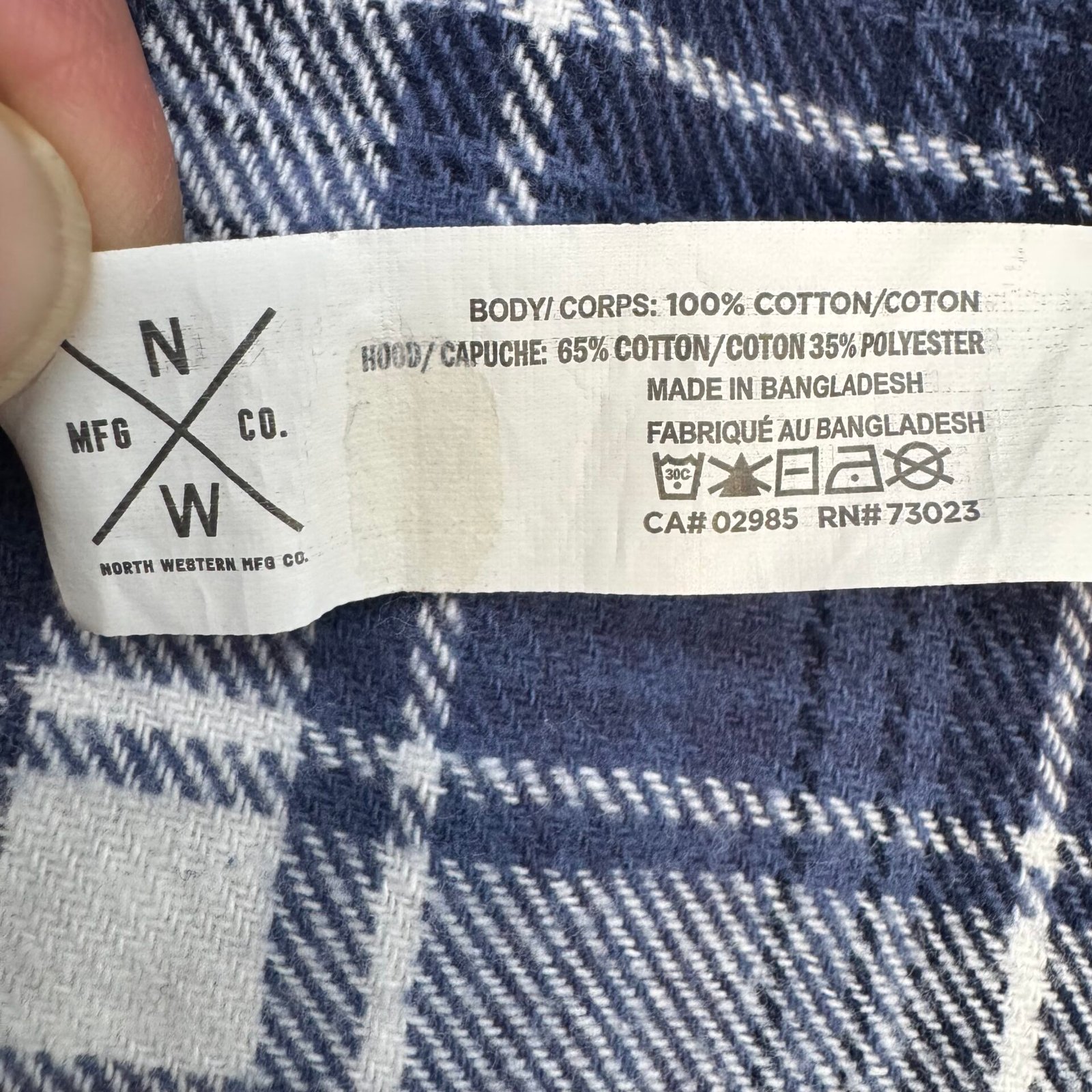 Men’s plaid hooded flannel shirt by NW (North Western MFG Co.) in blue and white colorway.