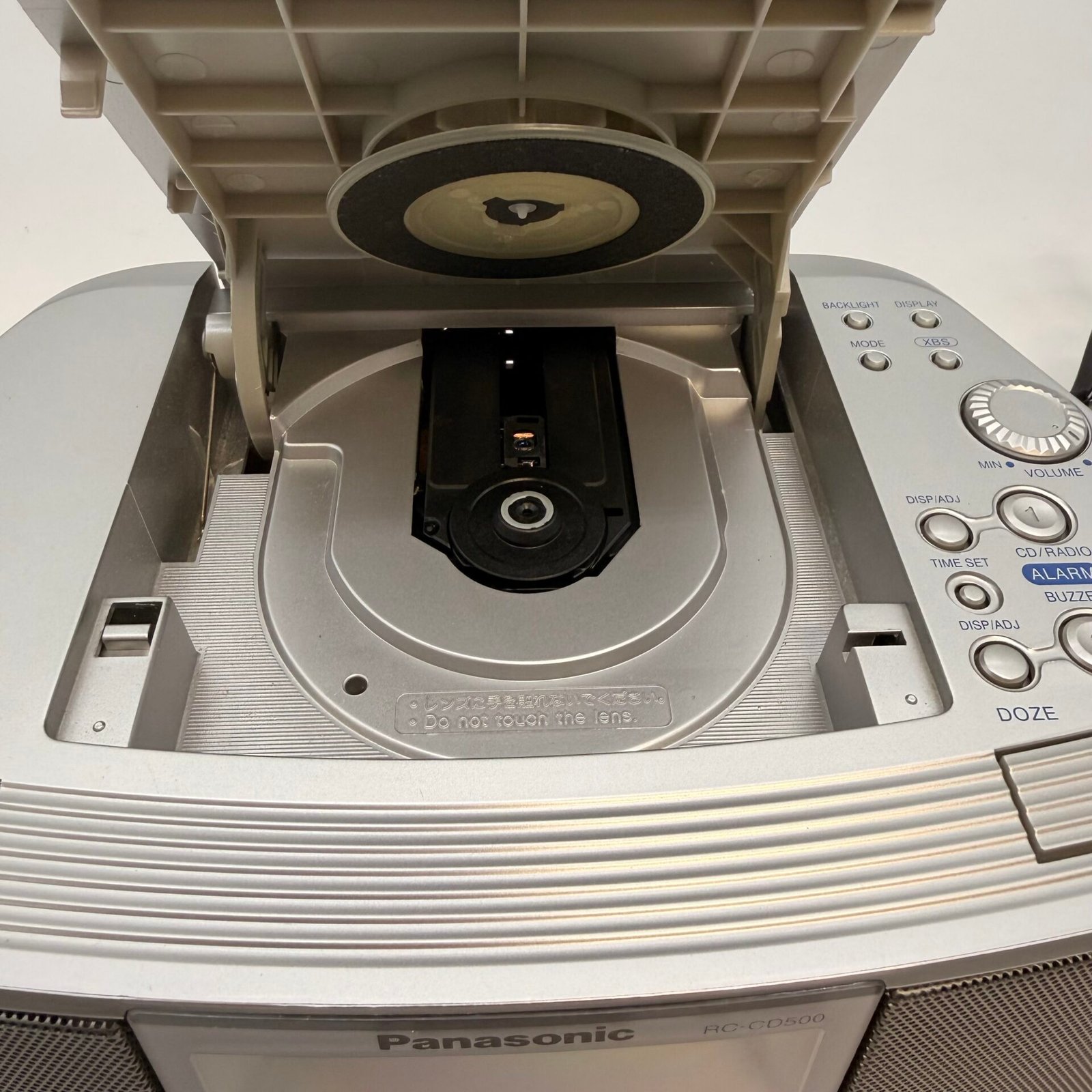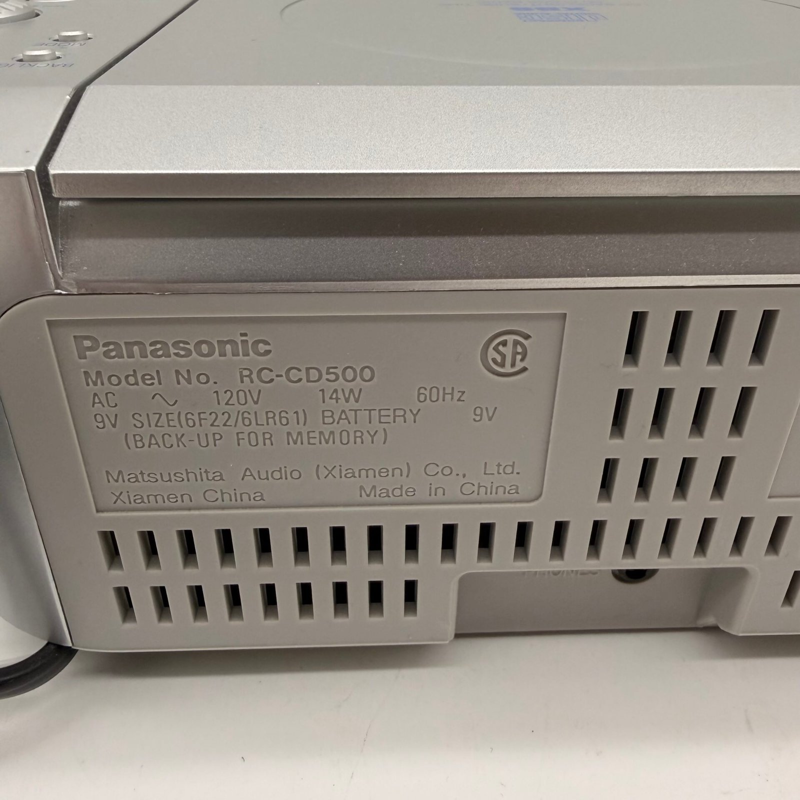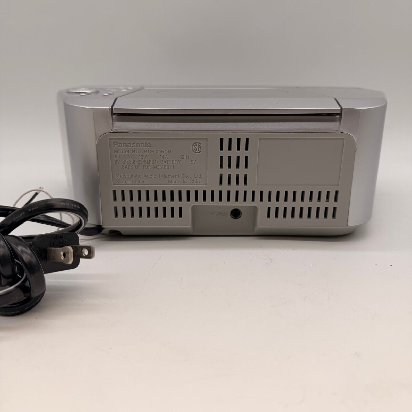 Panasonic RC-CD500 CD clock radio alarm in like new condition. Tested and works great. Includes the original box. Clean silver finish and very nice overall cosmetic condition. Ideal for bedside use with CD player, AM/FM radio, dual alarm, and headphone jack.