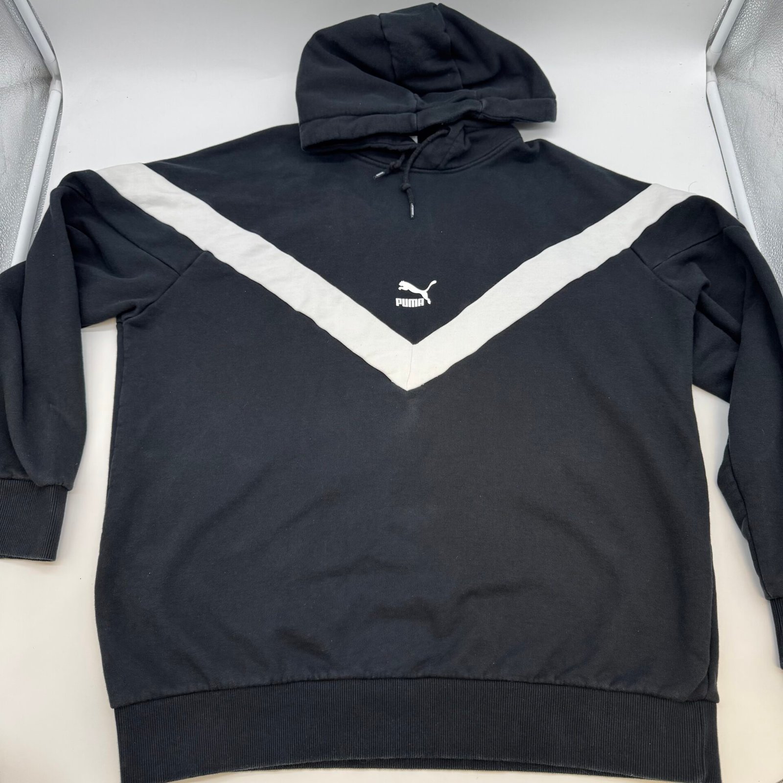 PUMA Men’s Vintage Style V-Stripe Hoodie Black White Logo Pullover Size L