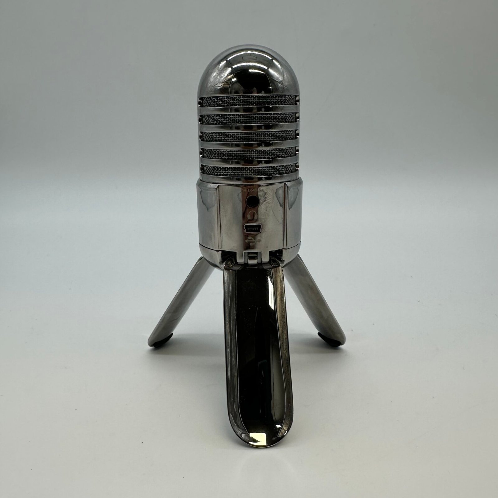 Samson Meteor Mic USB Studio Condenser Microphone in chrome finish with integrated foldable tripod stand.