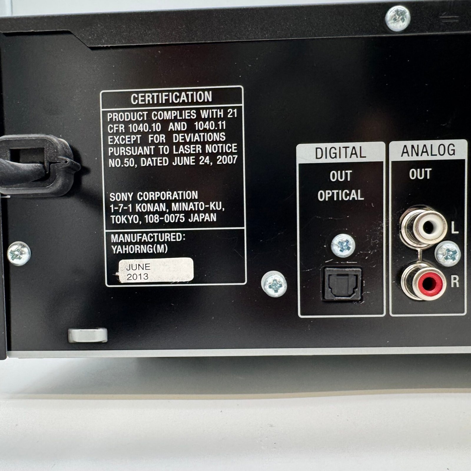 This Sony CD player features a 5-disc changer system, allowing you to load multiple CDs and switch between them easily. It also includes a USB port for playback or recording, along with analog RCA and optical digital outputs for connection to stereo systems or receivers.