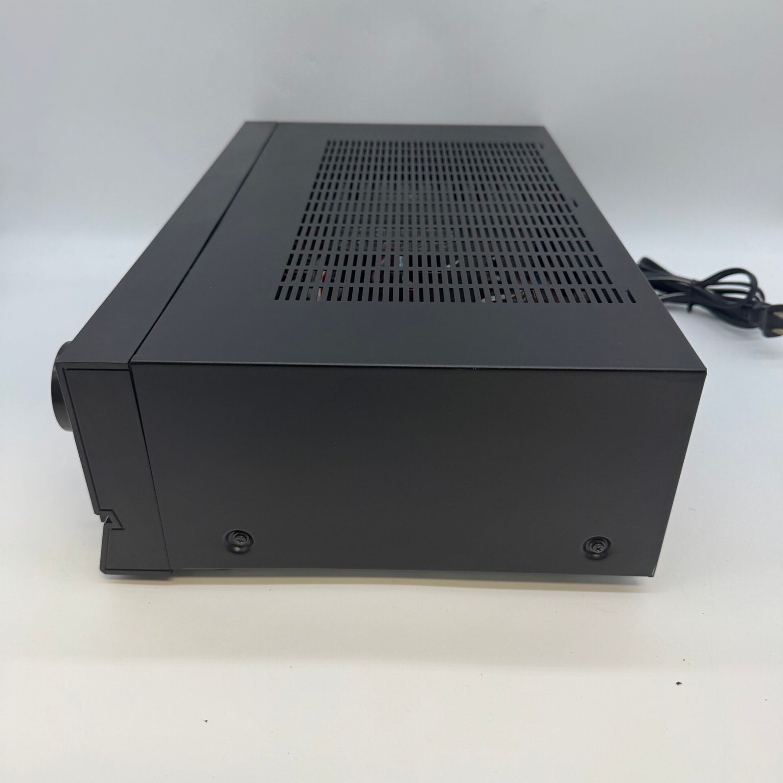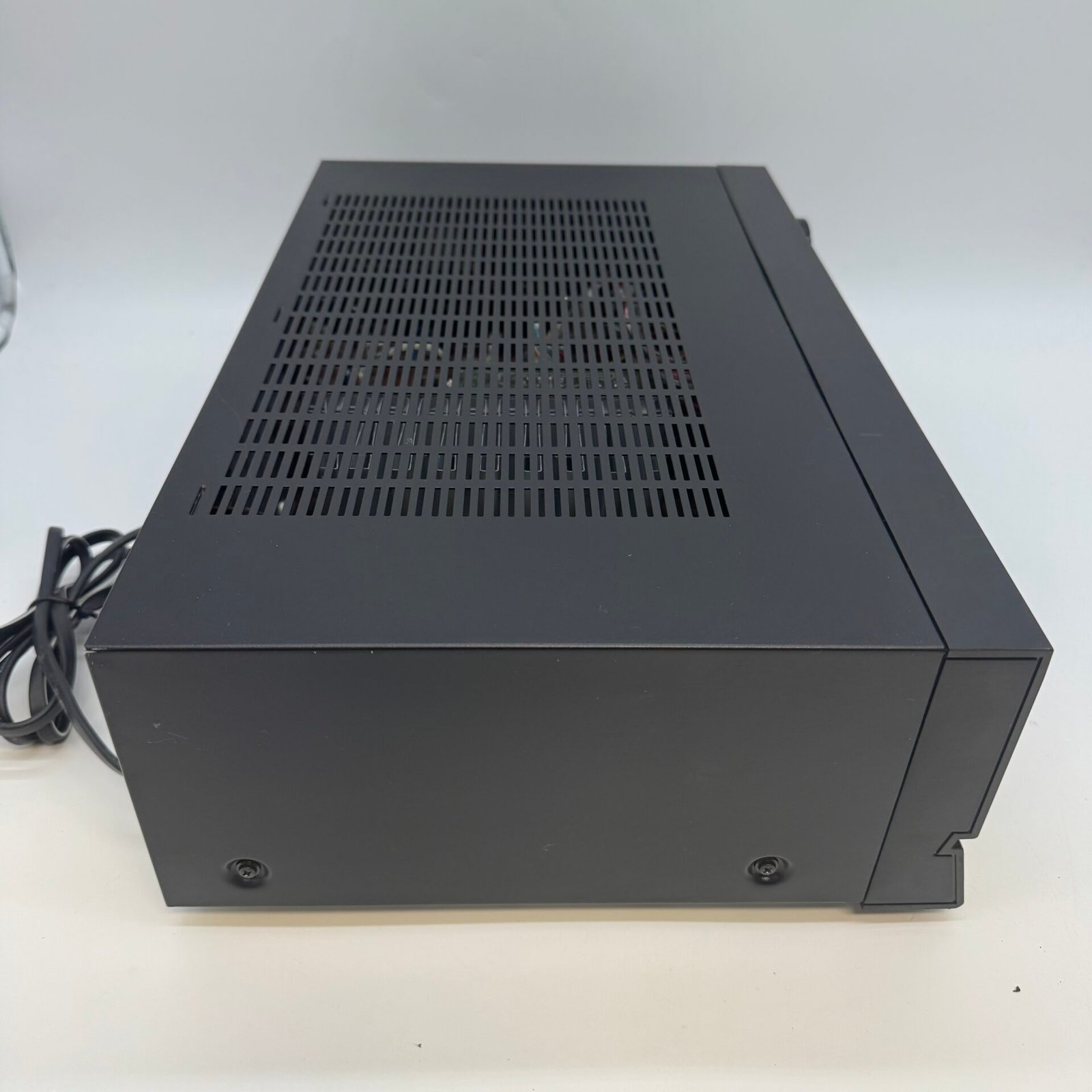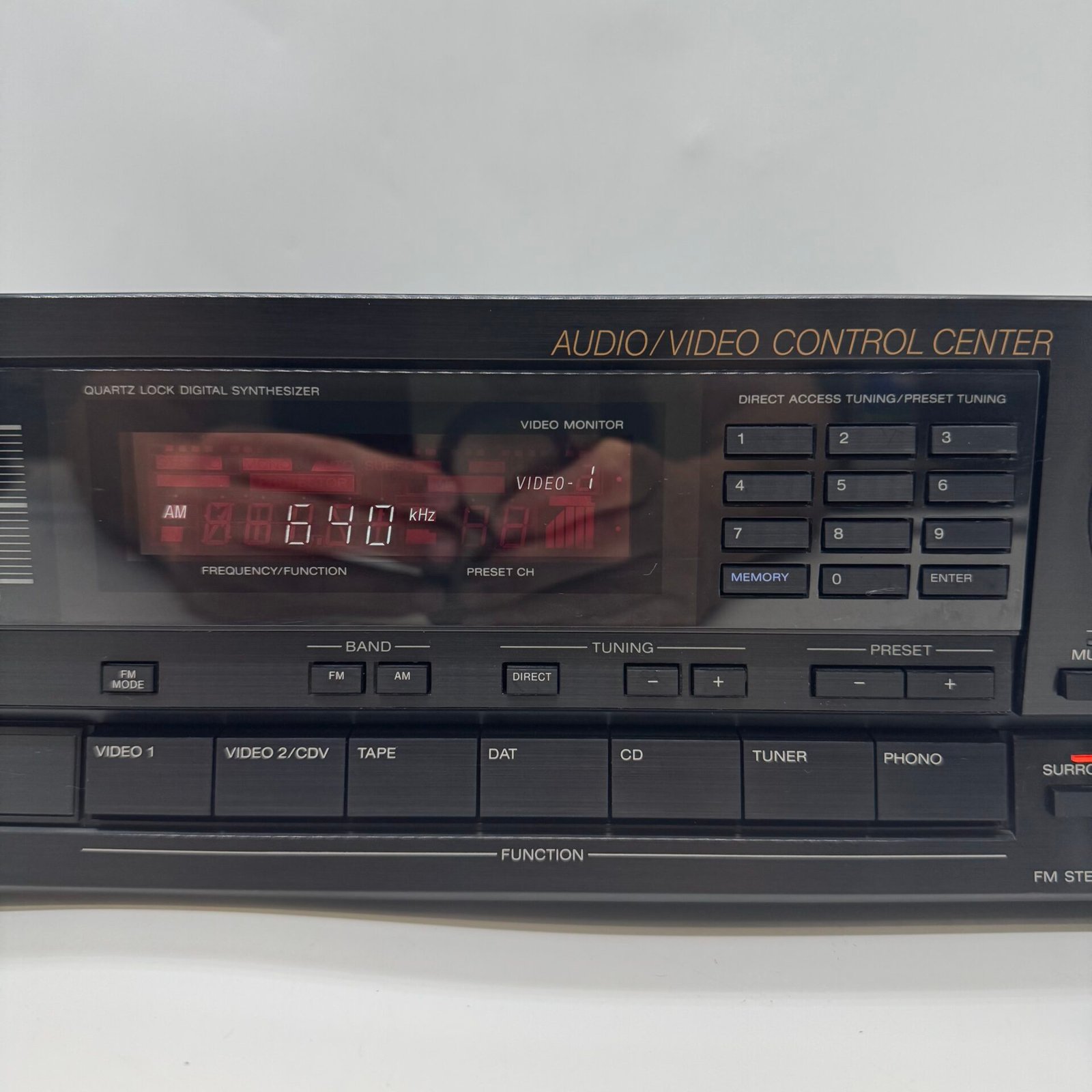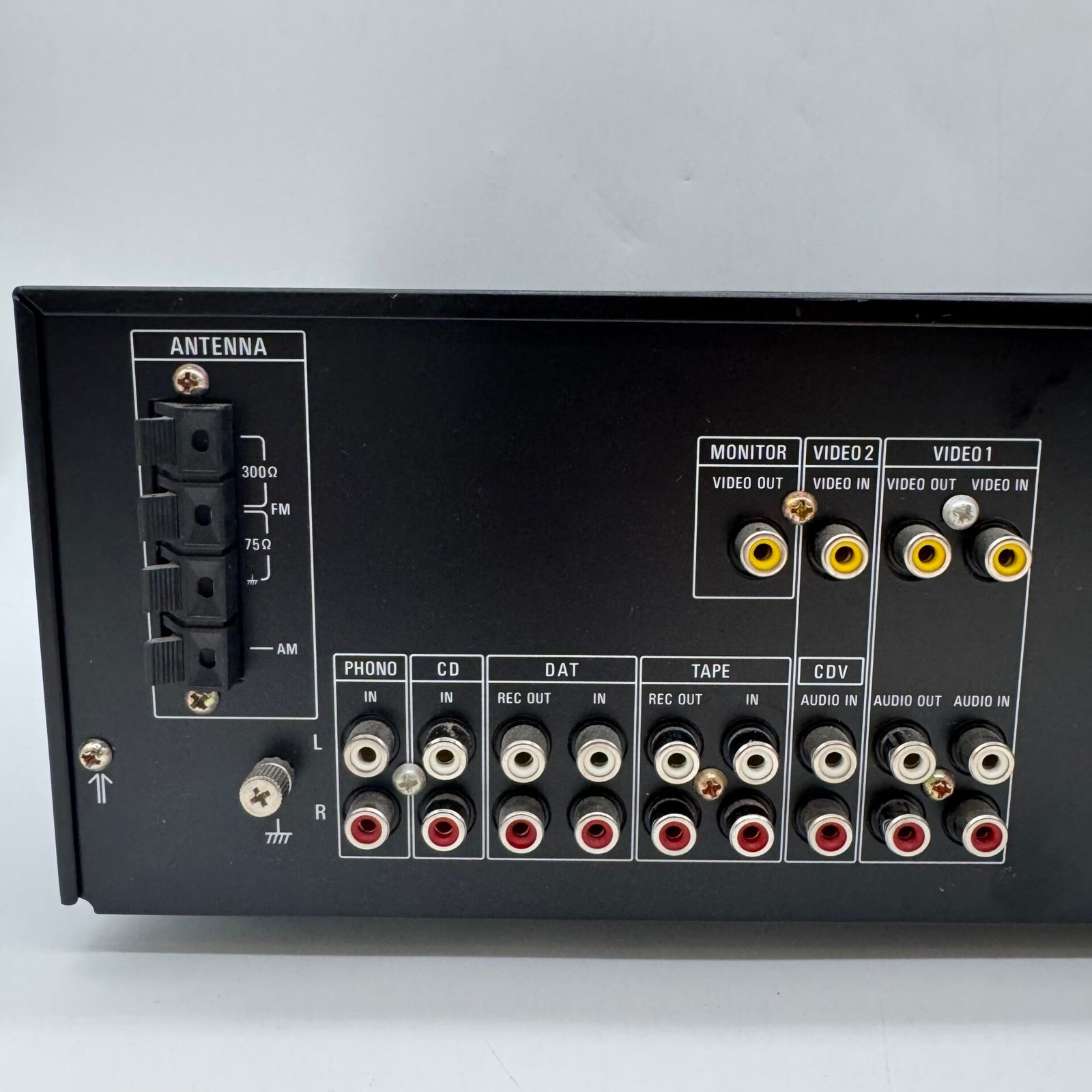 This classic 1990s receiver features a built-in 5-band graphic equalizer, AM/FM tuner, and multiple audio inputs including Phono, CD, Tape, DAT, and Video, making it ideal for both vintage and modern audio setups.