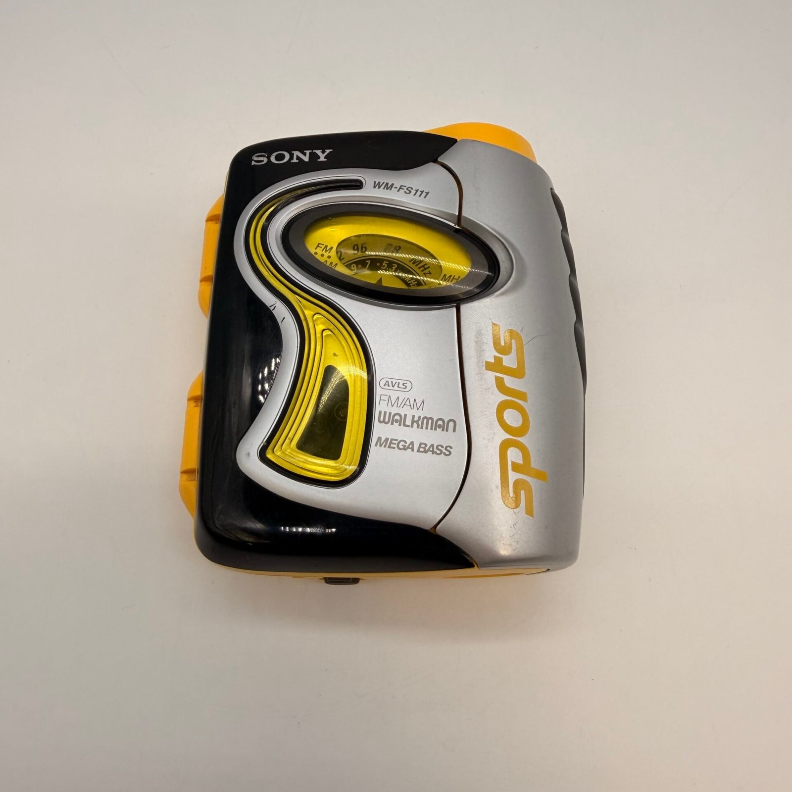 Features Mega Bass, AVLS volume limiting, and classic yellow sports styling.