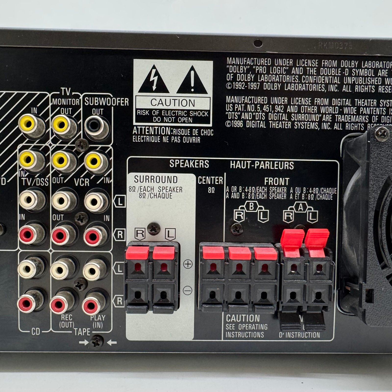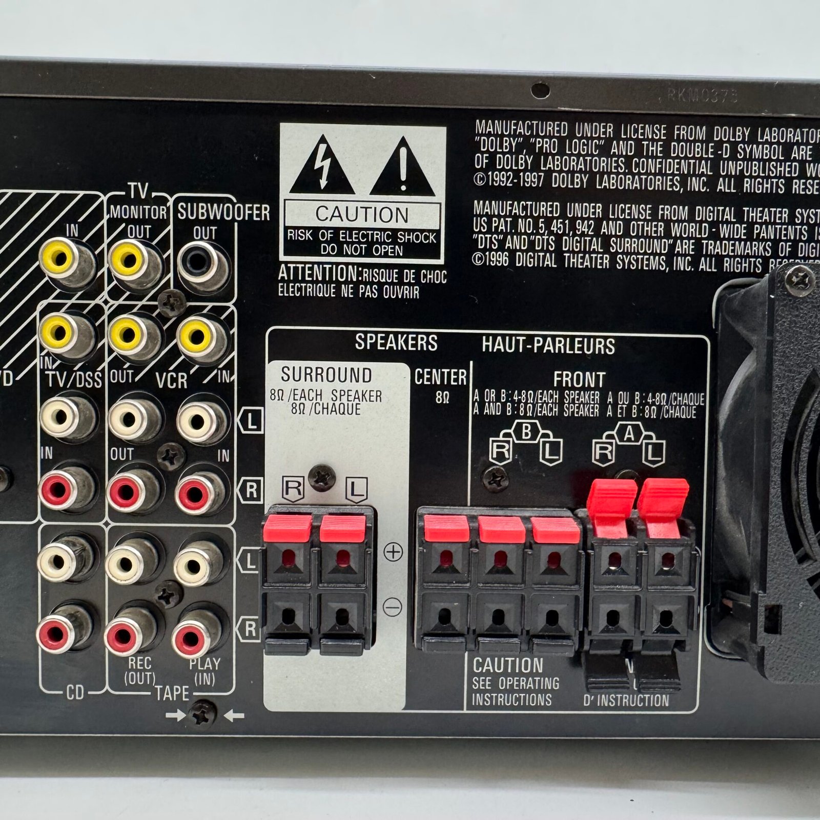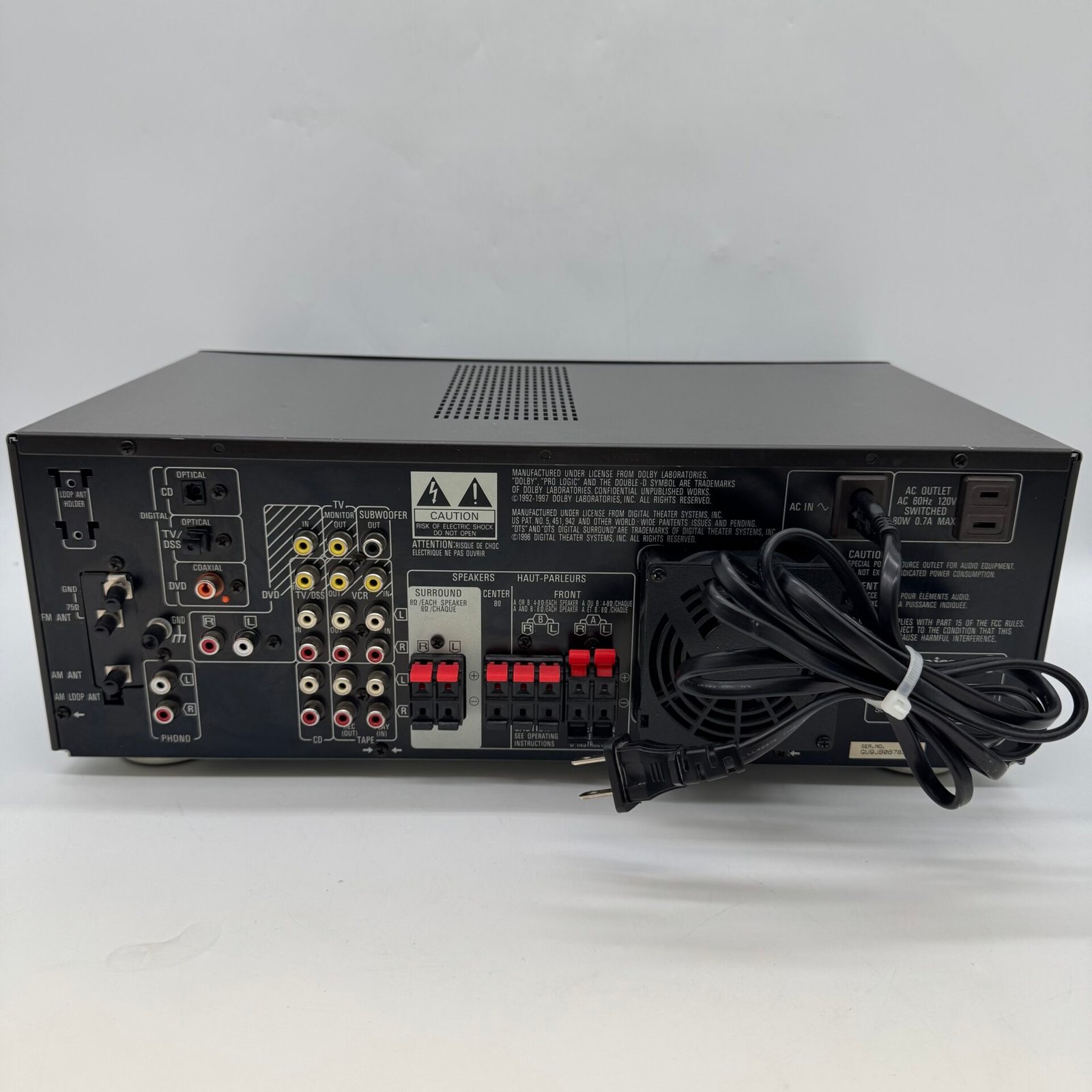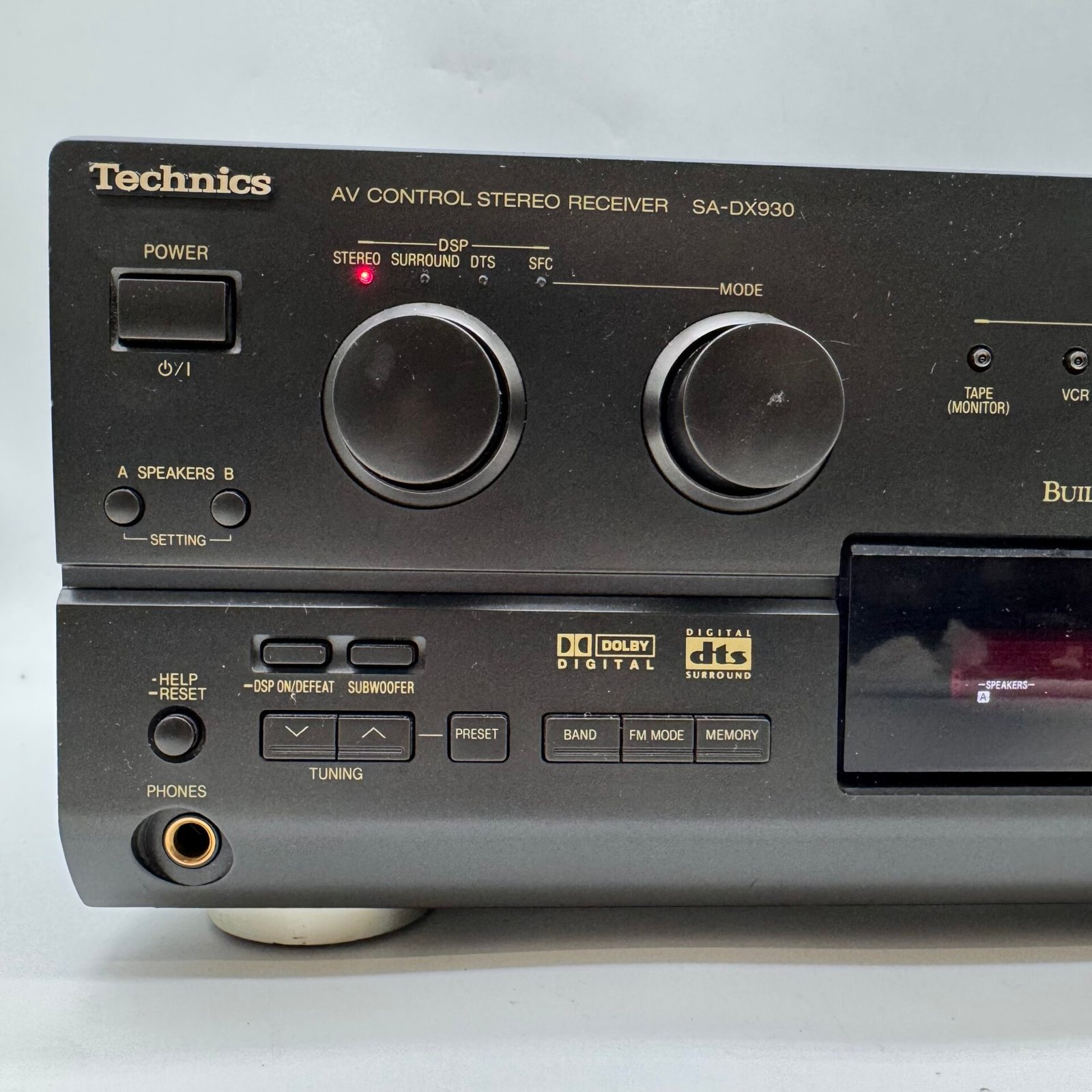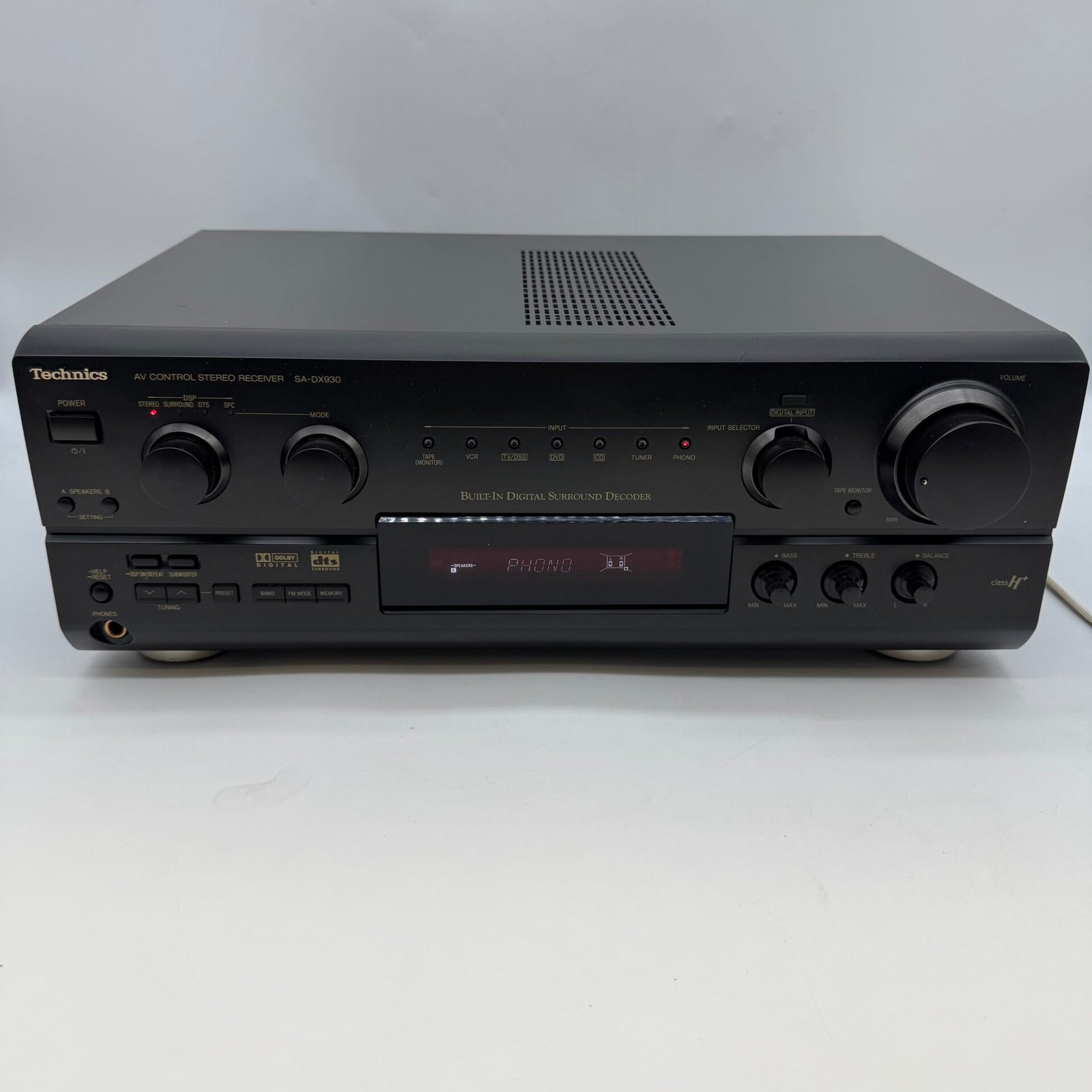 This is a high-quality Technics receiver featuring built-in Dolby Digital and DTS surround sound, delivering powerful and clear audio performance. The unit is well-built with solid construction and reliable Class H+ amplification.