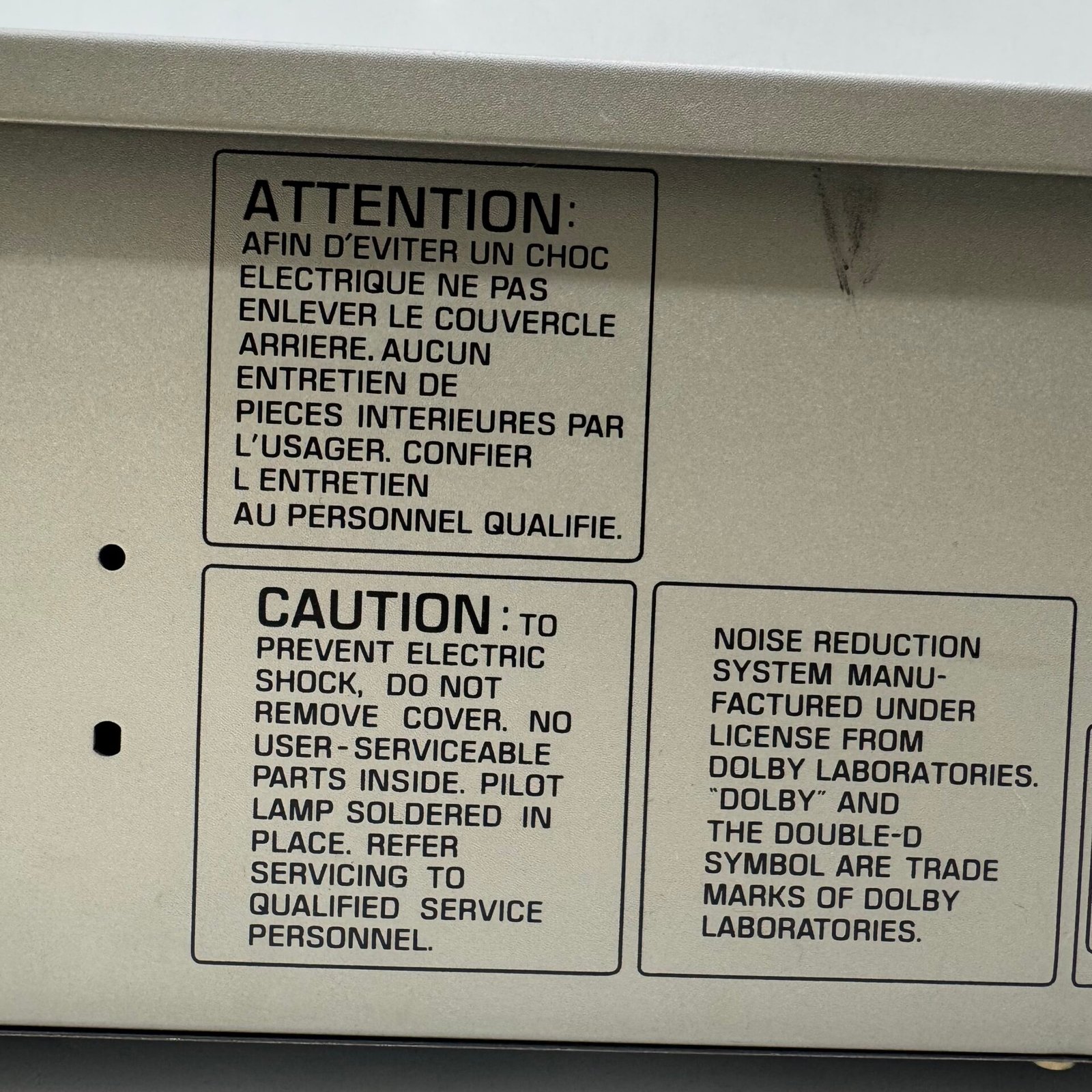 Features classic analog VU meters with peak indicators, Dolby Noise Reduction system, and multiple input/output controls.
