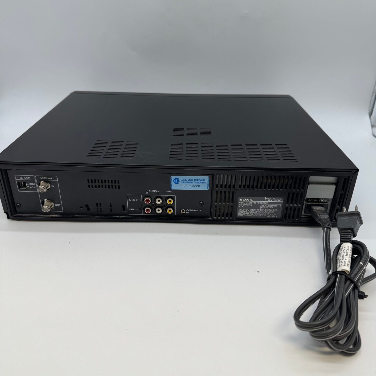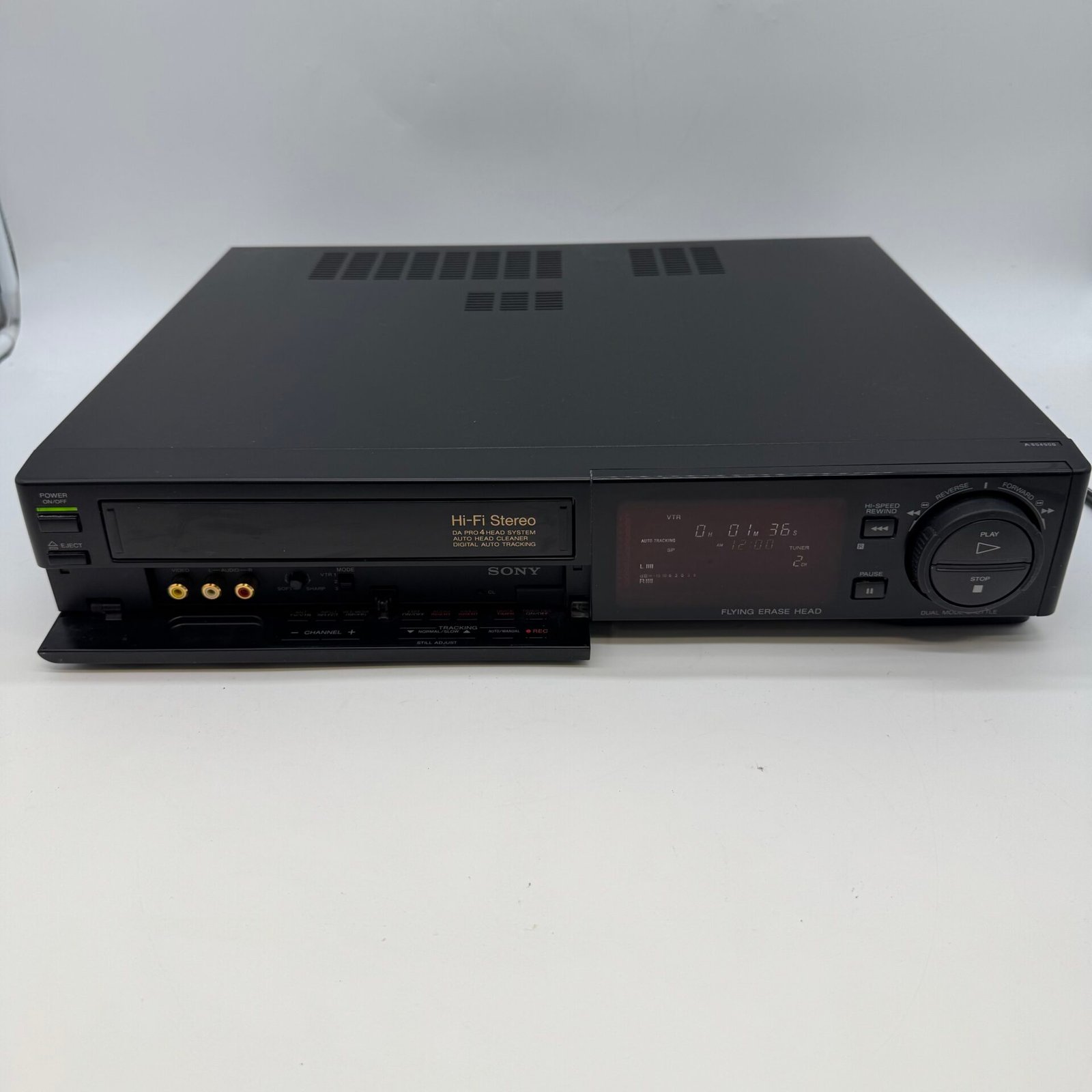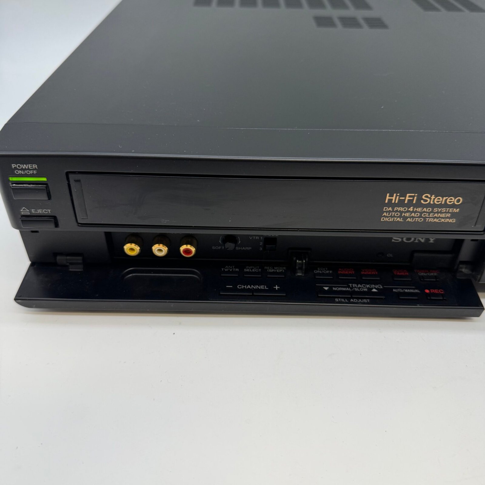 This classic Sony VCR features Hi-Fi stereo sound, digital auto tracking, and a 4-head system for improved playback quality.