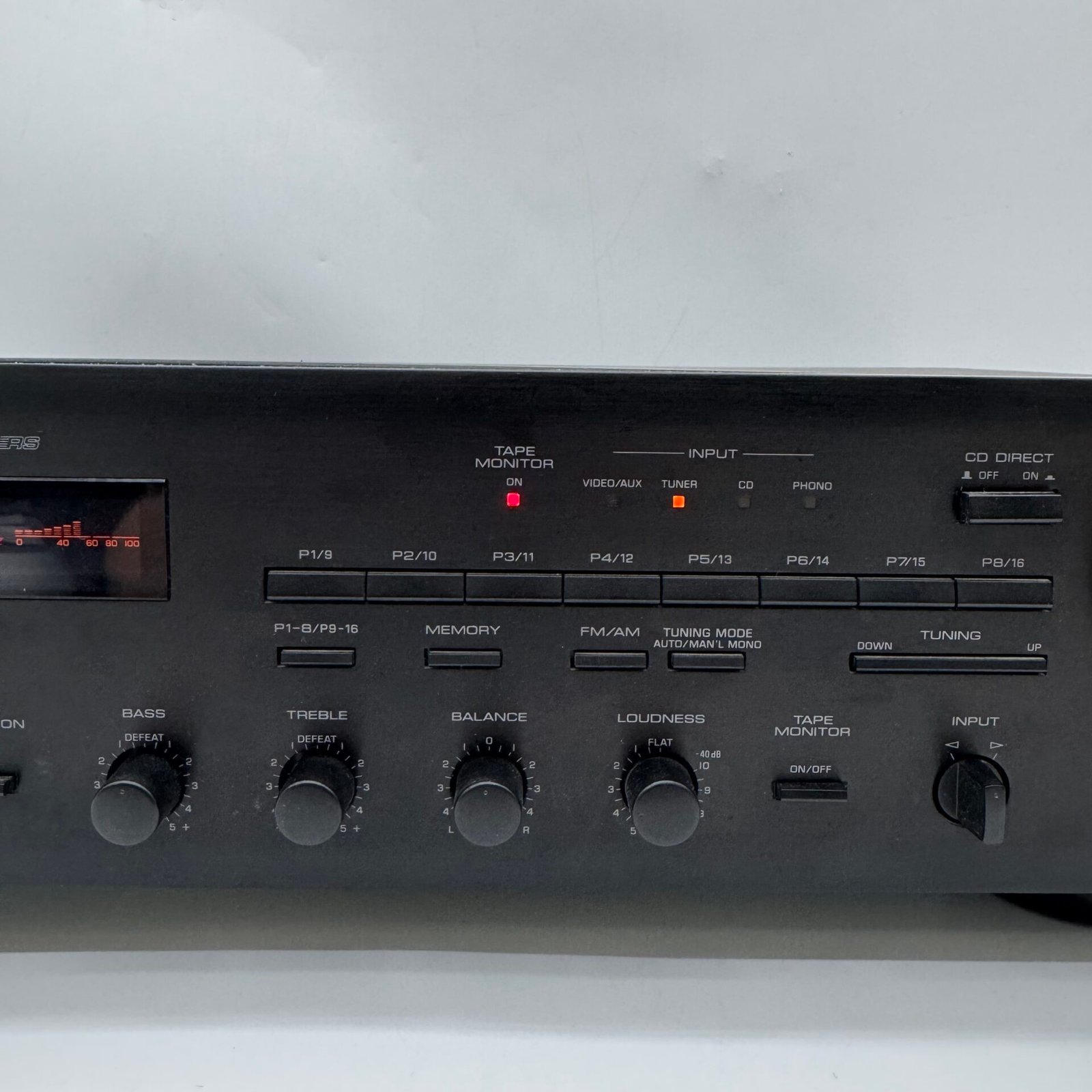 AM/FM tuner works properly and all main controls respond normally. It features multiple inputs including Phono, CD, Video/AUX, and Tape, allowing connection to a variety of audio sources. Speaker A/B outputs and a headphone jack are also included.