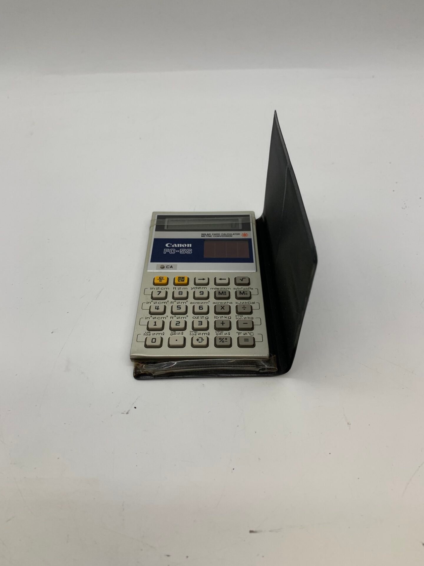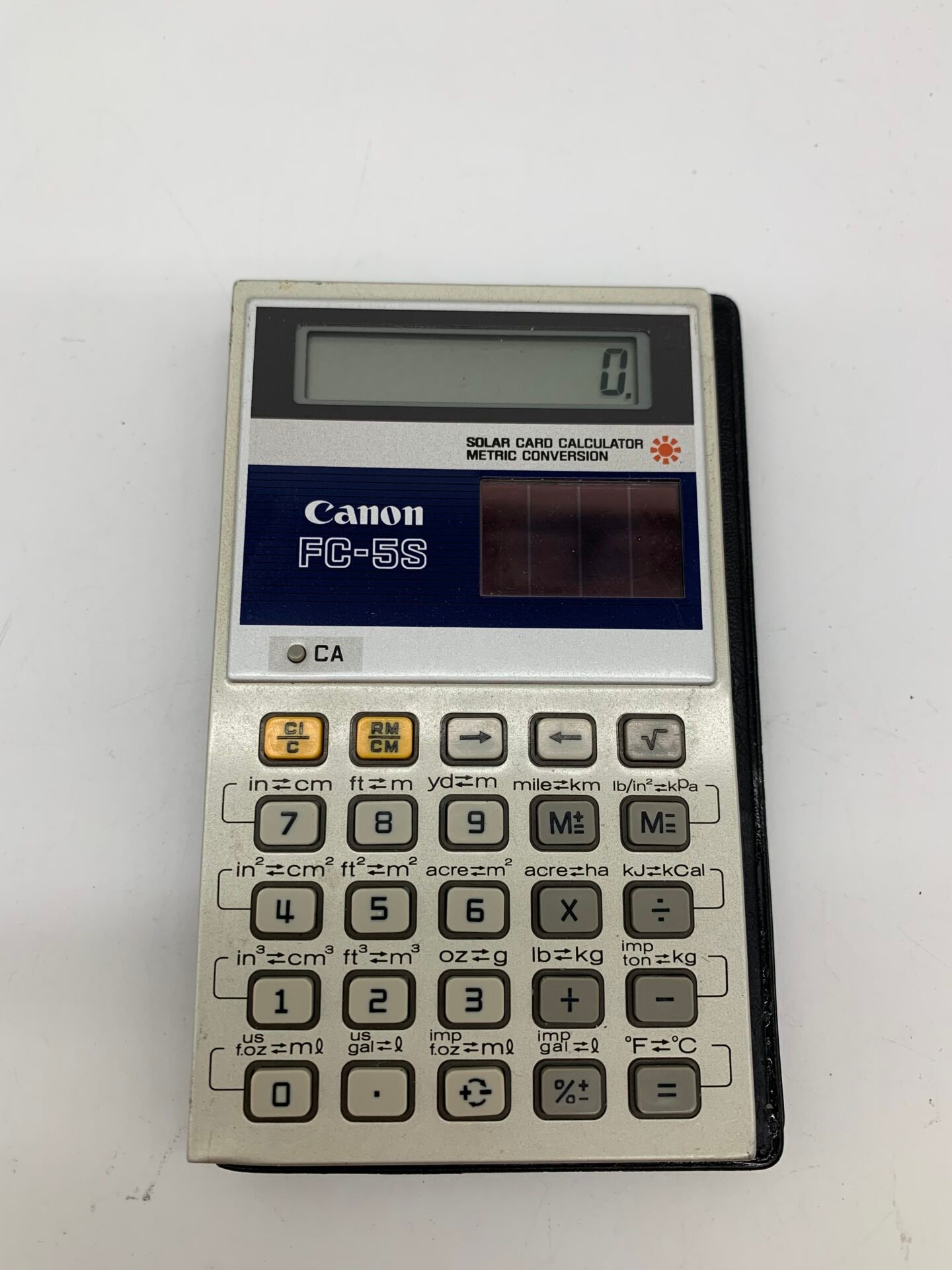 Vintage Canon FC-5S solar calculator with built-in metric conversion functions.