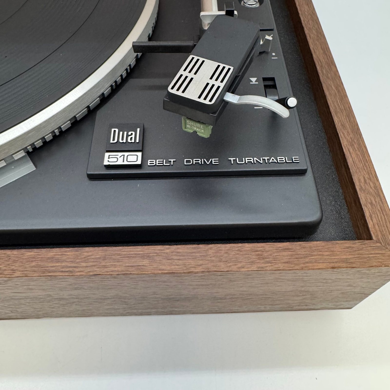 Equipped with a Shure Hi-Track cartridge, delivering warm and clear analog sound. Adjustable pitch control, anti-skating, and 33/45 RPM speed selector are all functional.