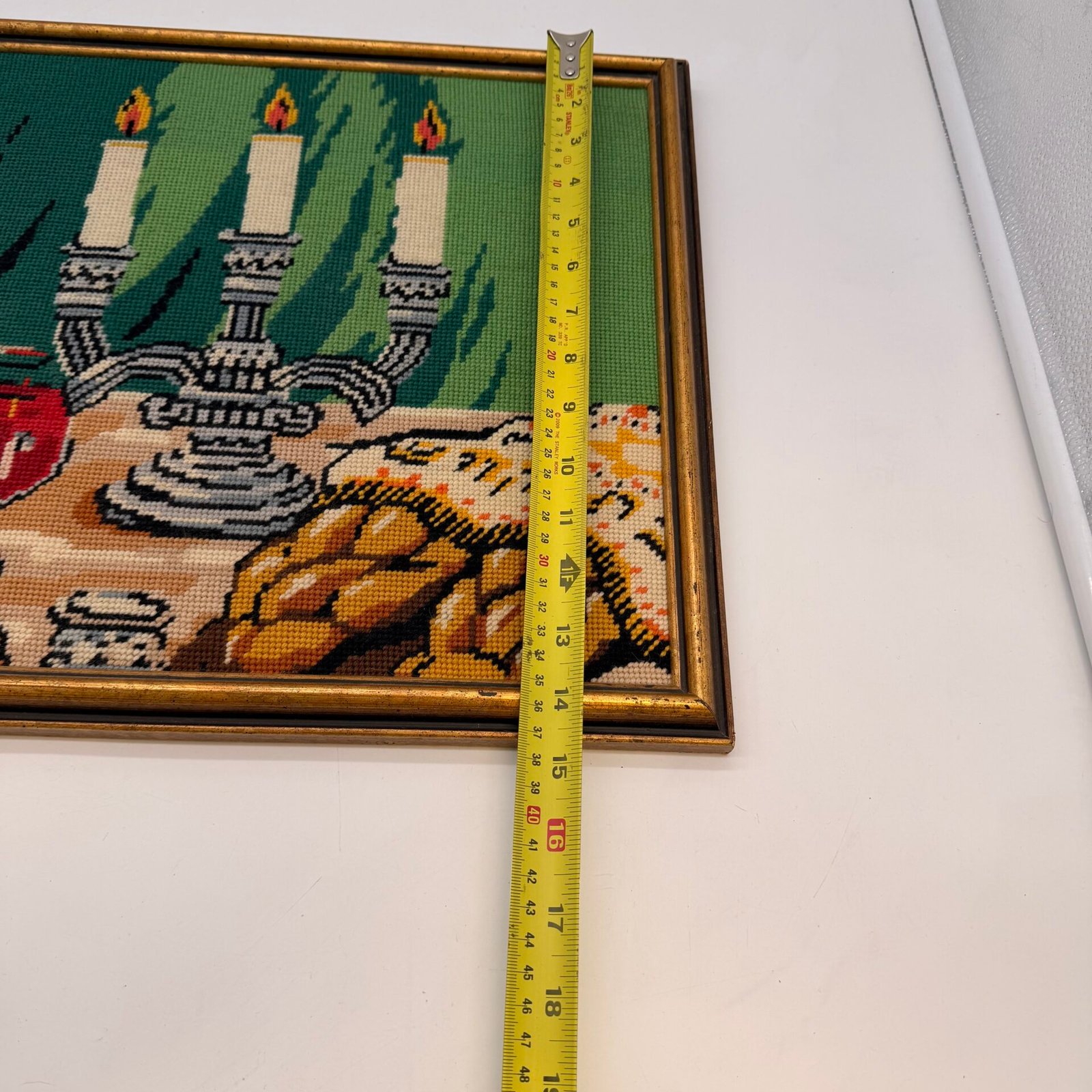 Charming vintage needlepoint wall art featuring a classic still life scene with wine, candles, bread, and table setting. This handcrafted piece is framed in a wood frame and ready to hang, making it perfect for vintage home décor, dining rooms, or kitchen walls.