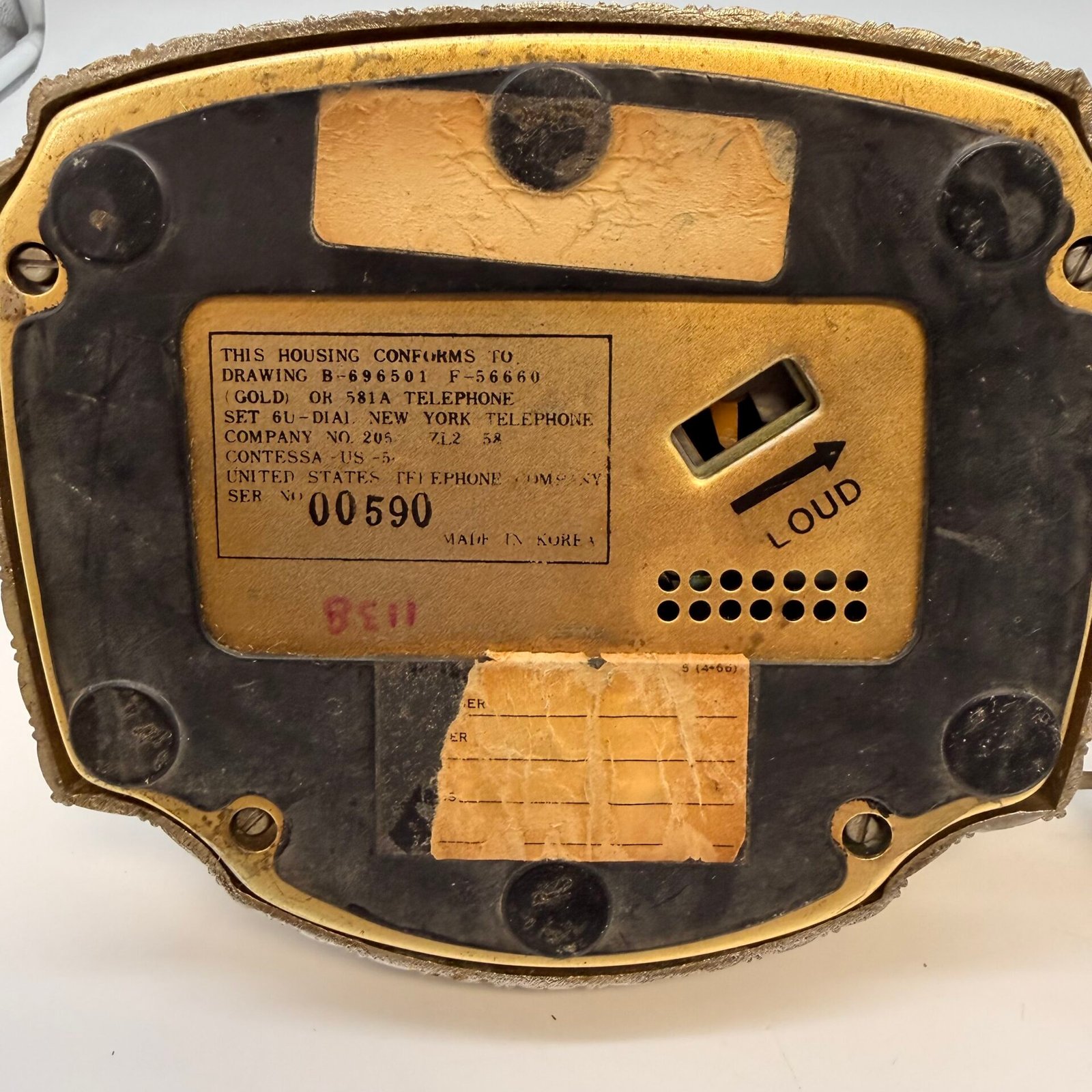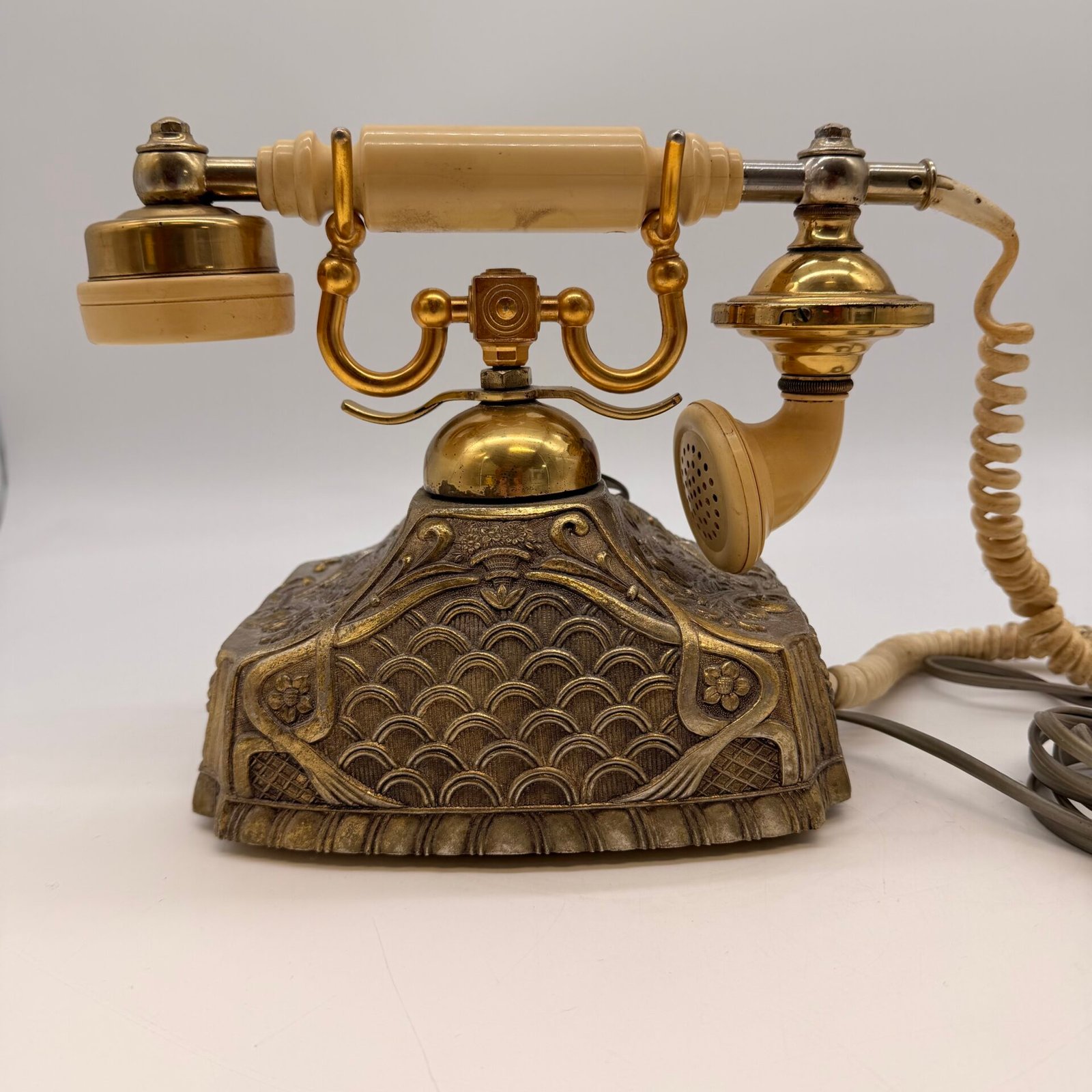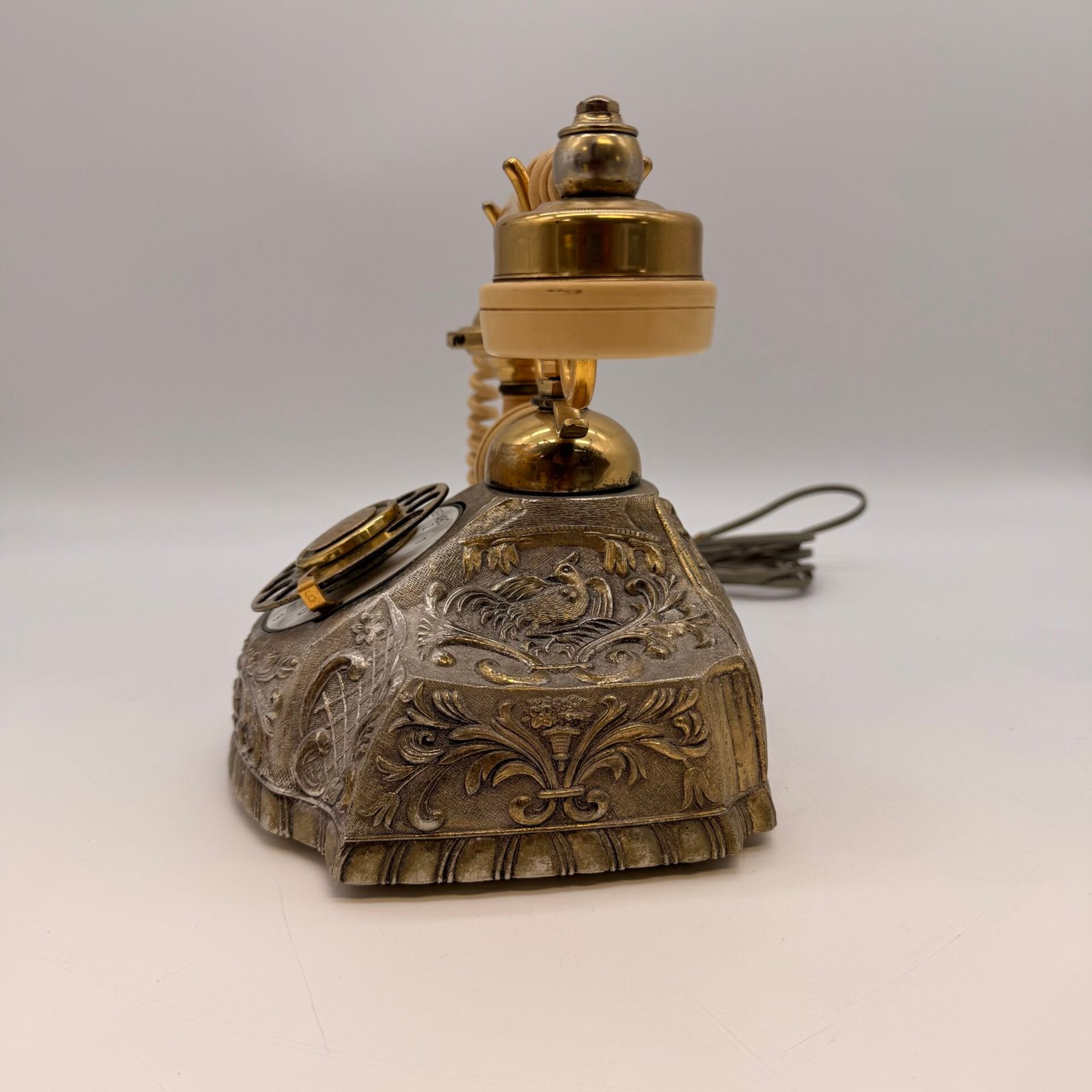 Vintage-style Hollywood Regency rotary dial telephone featuring an ornate cast-metal base with gold and bronze detailing. Inspired by early 20th-century telephone designs and produced in Korea during the late 20th century.