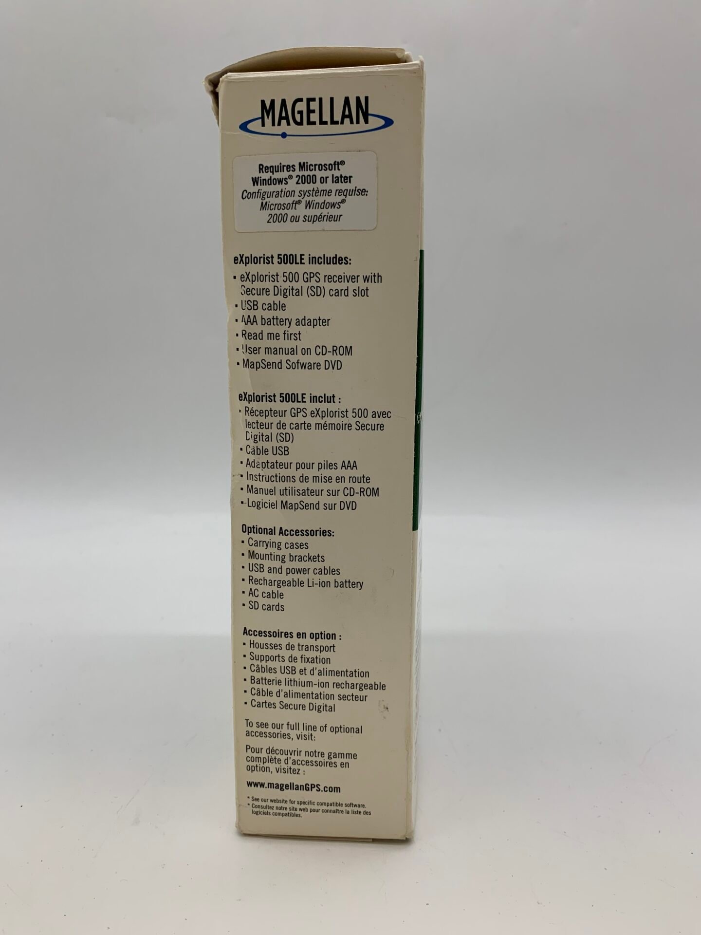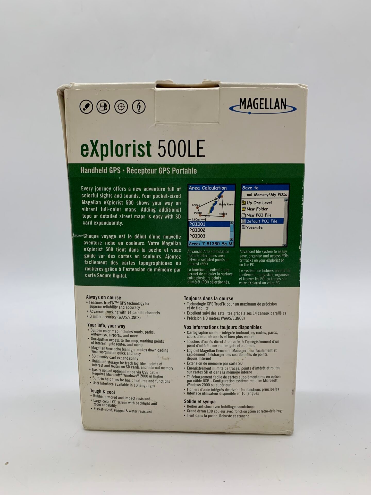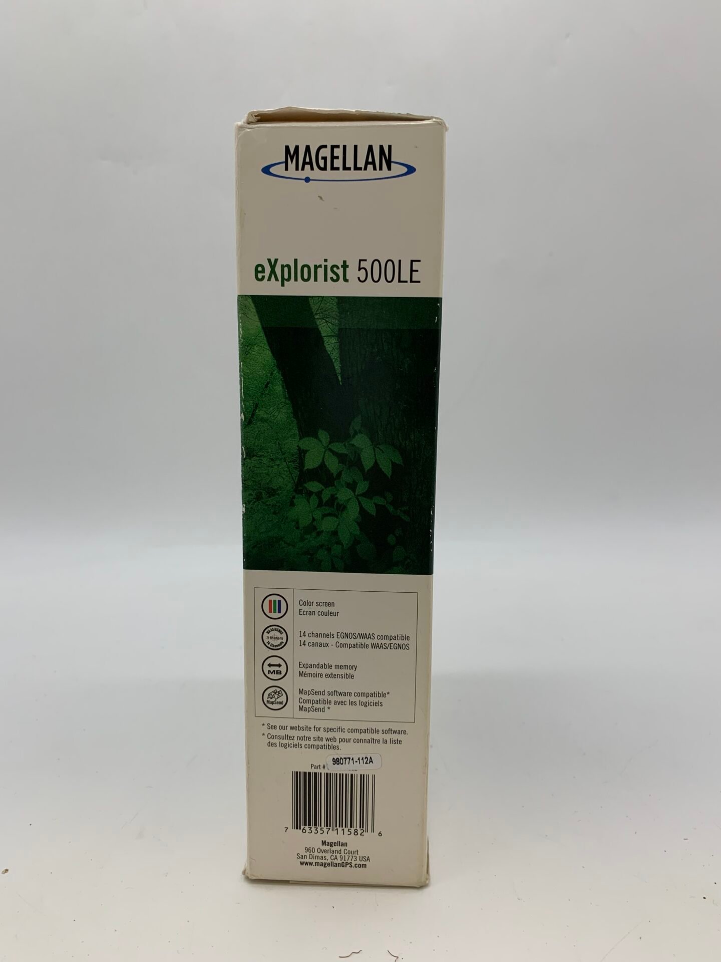 A vintage Magellan eXplorist 500LE handheld GPS unit in excellent open box condition.