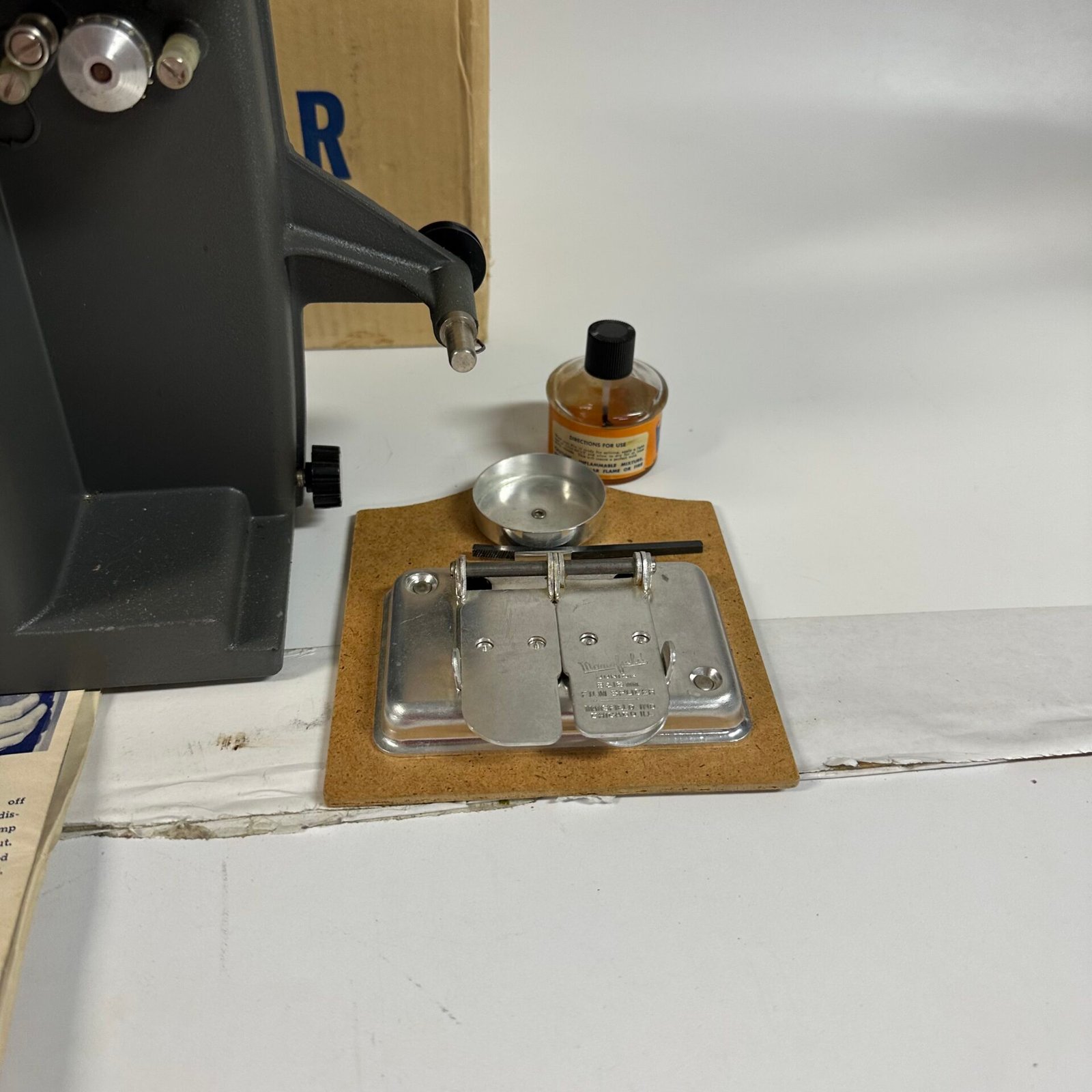 This classic mid-century projector is a great collectible for vintage film enthusiasts. The set includes several original accessories such as reels, film splicer, cine film cement, lamp bulb, manual, and original box.