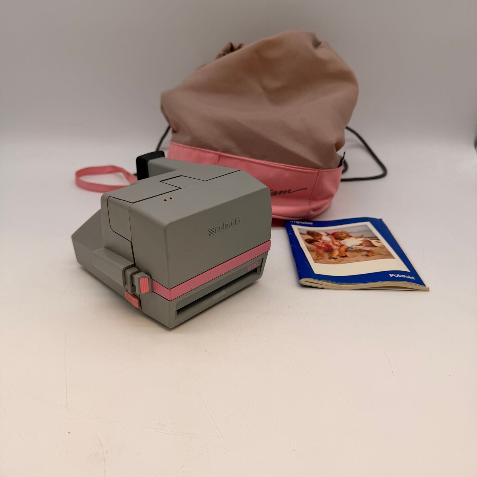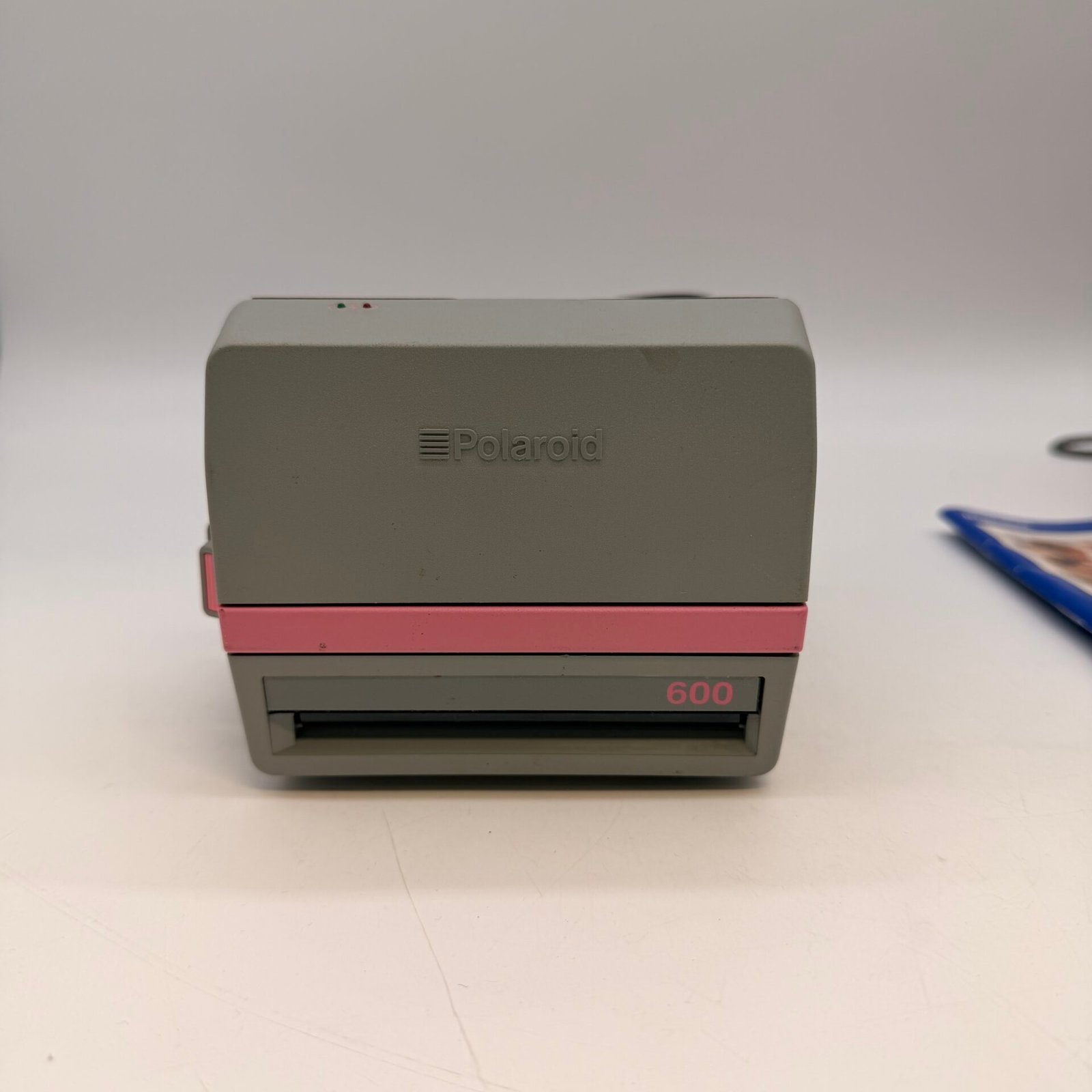 Original Polaroid 600 Cam instant camera in gray with pink accents.