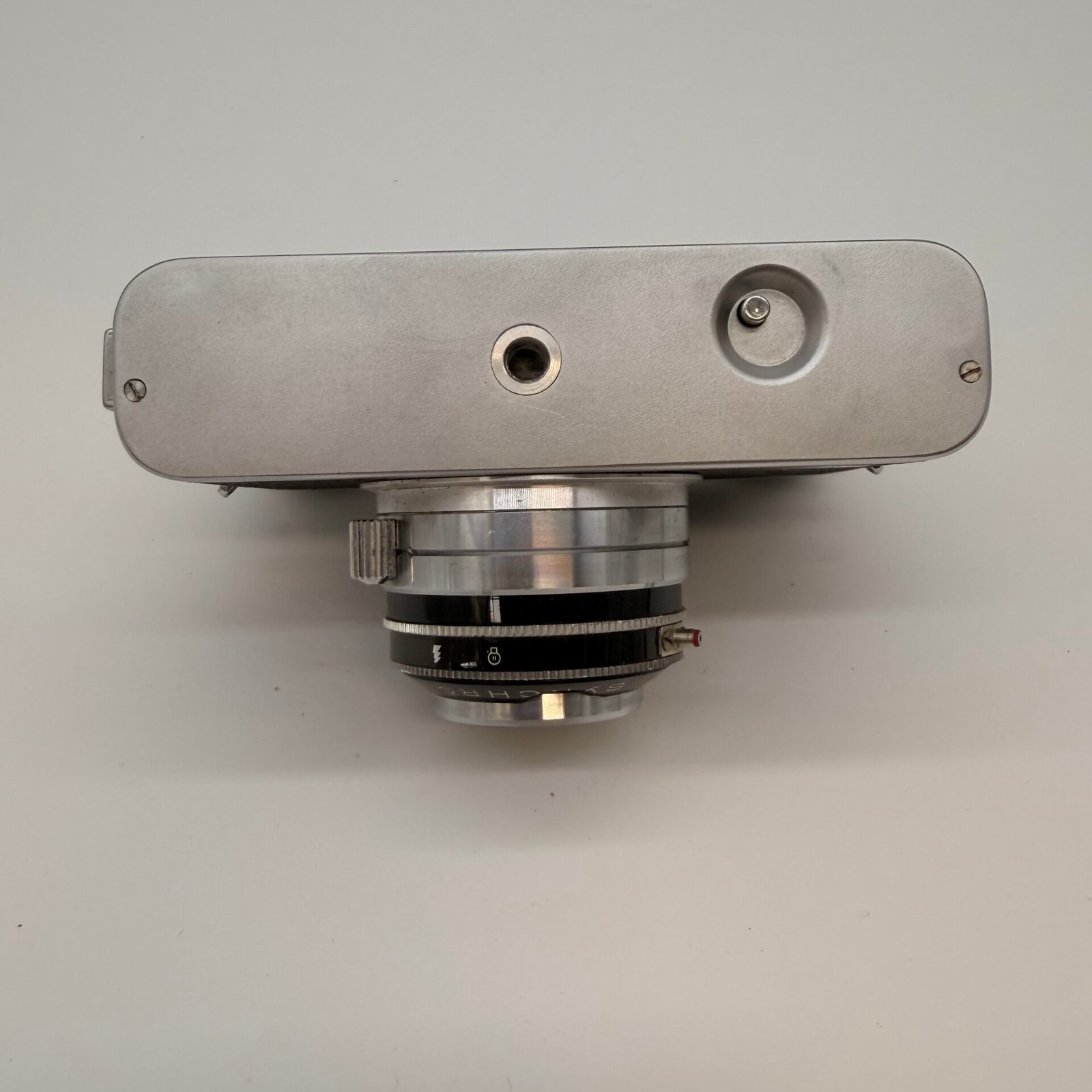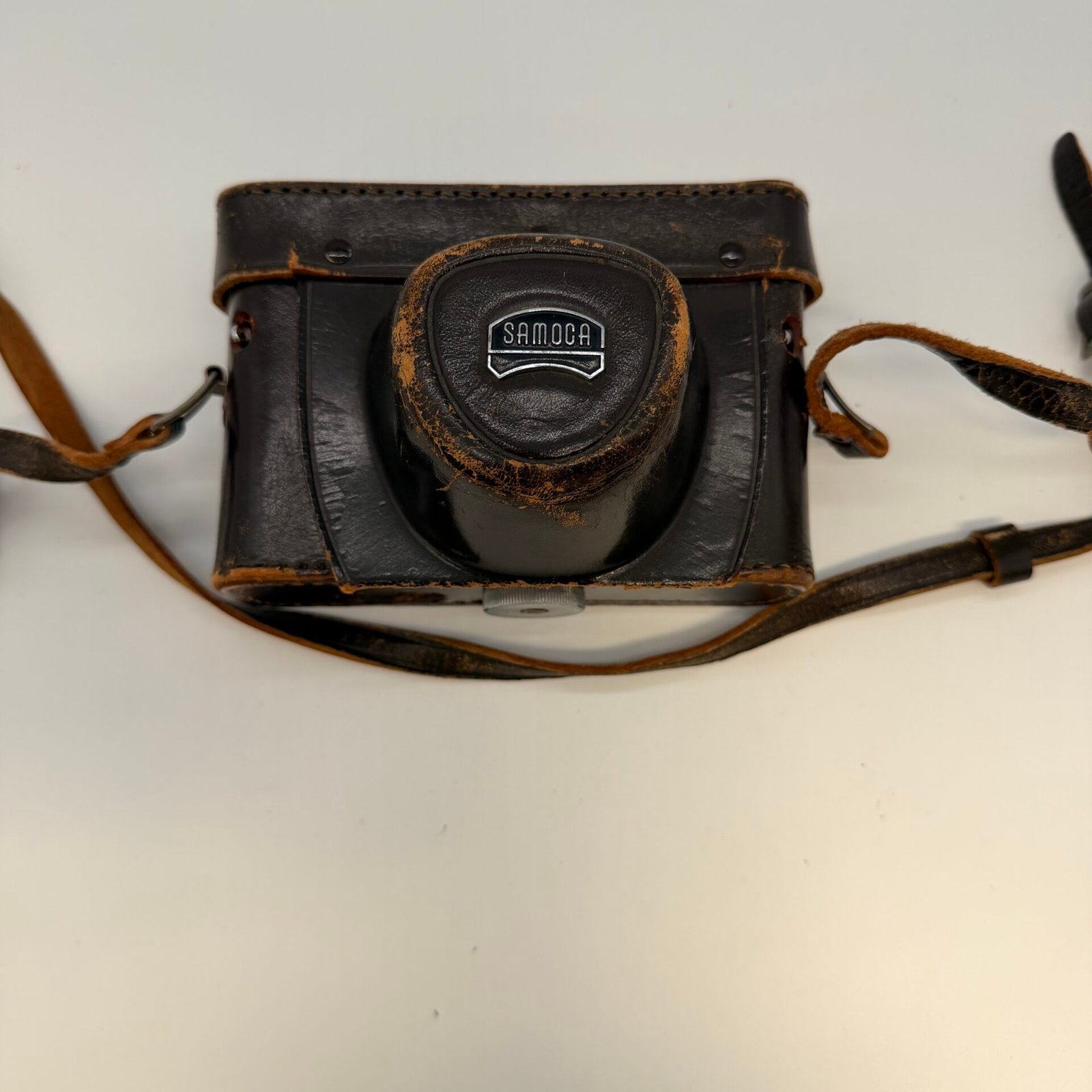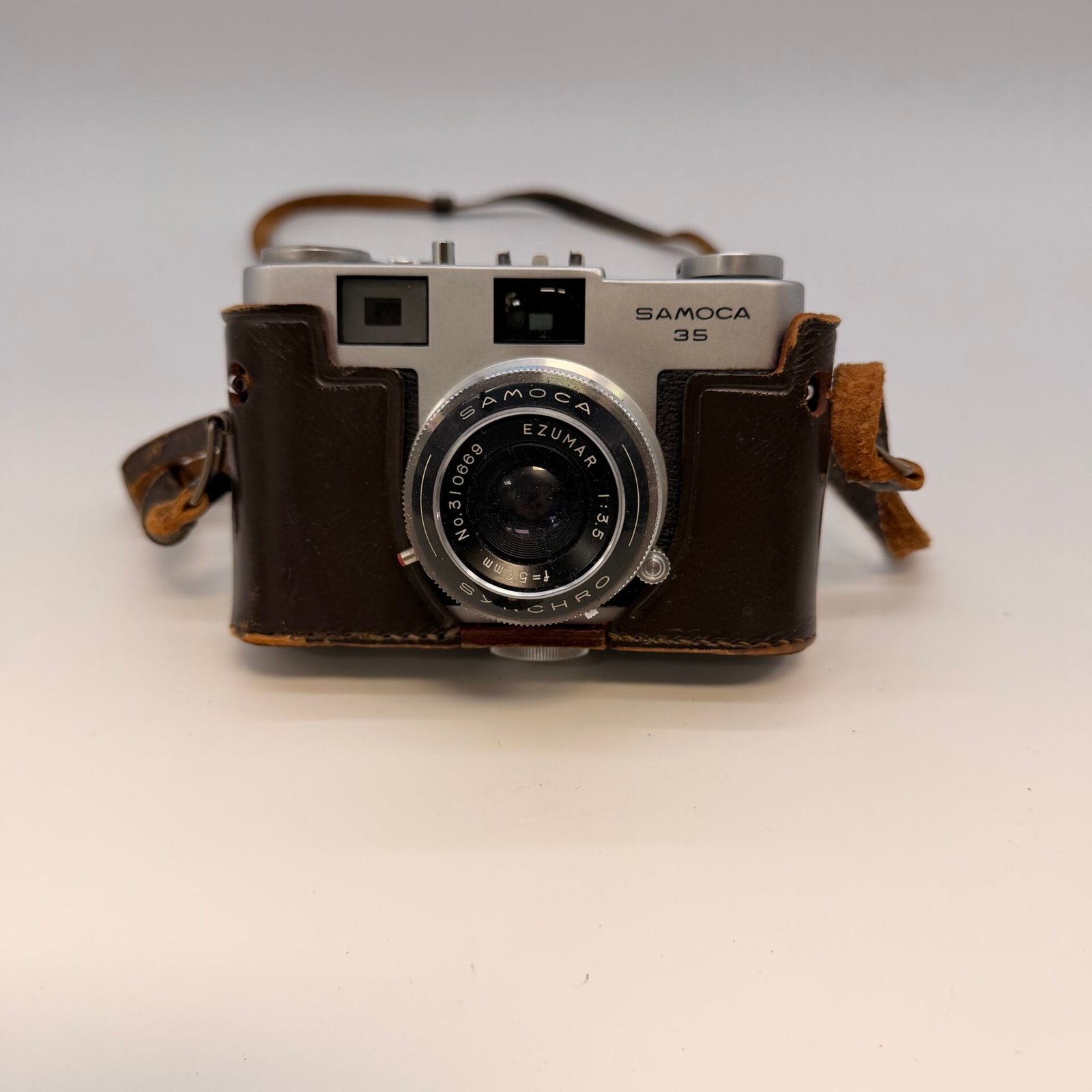 This classic film camera features the original Samoca Ezumar 50mm f/3.5 lens and retains its beautiful mid-century design with metal body and black leatherette covering.