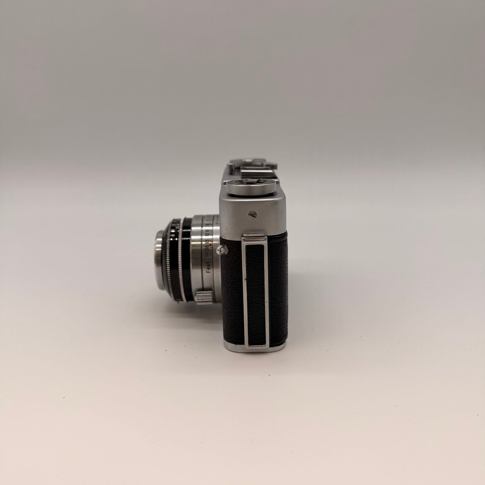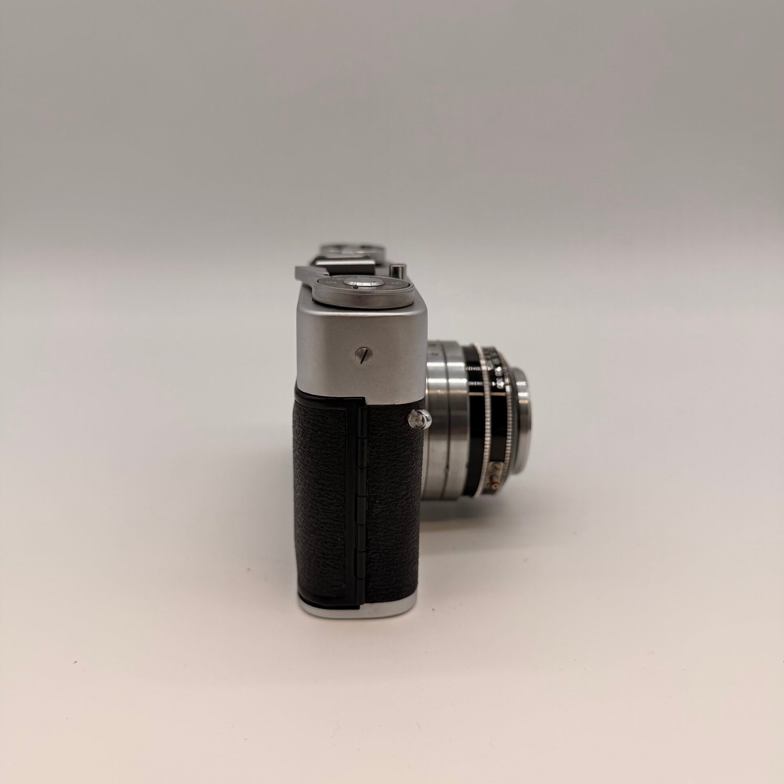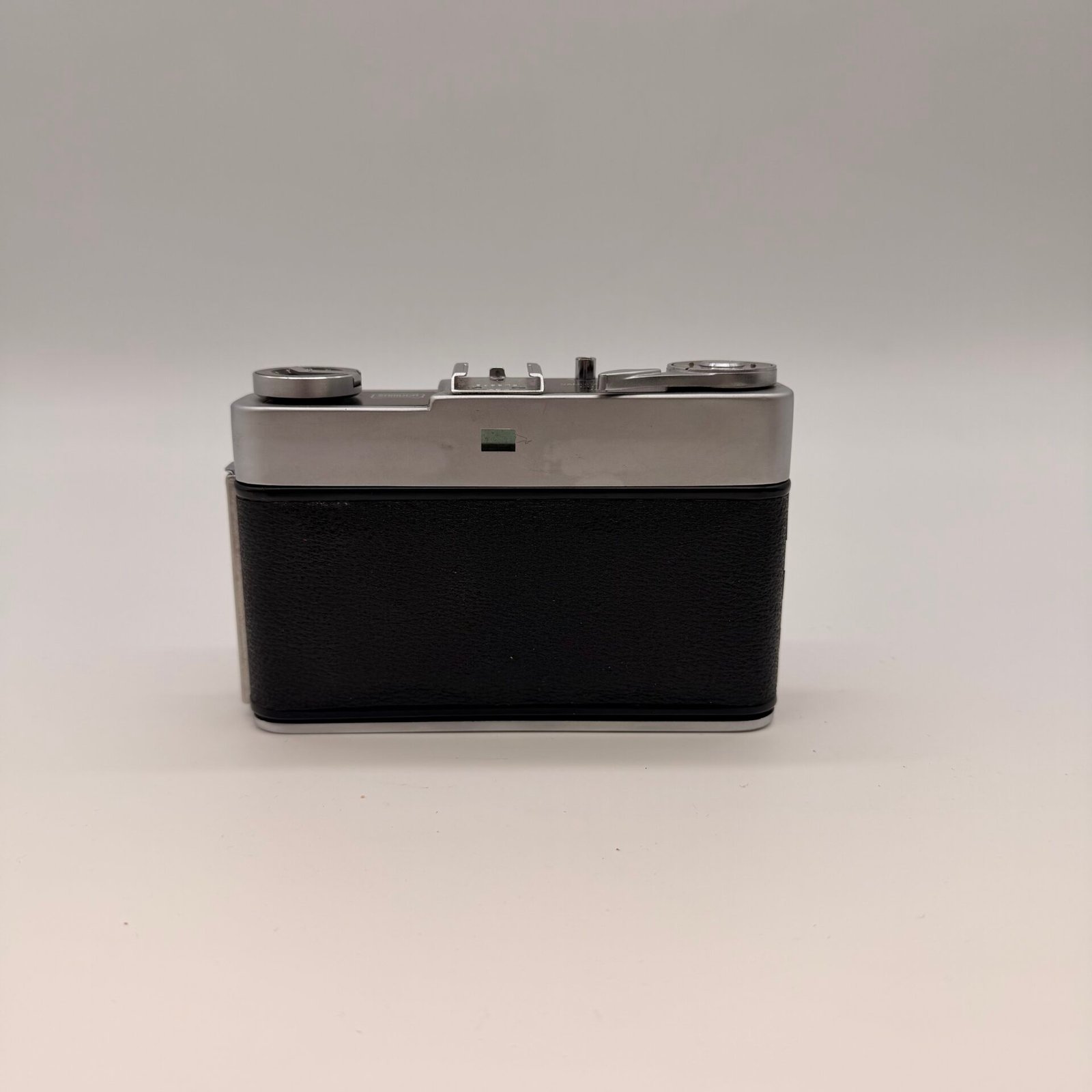 This classic film camera features the original Samoca Ezumar 50mm f/3.5 lens and retains its beautiful mid-century design with metal body and black leatherette covering.