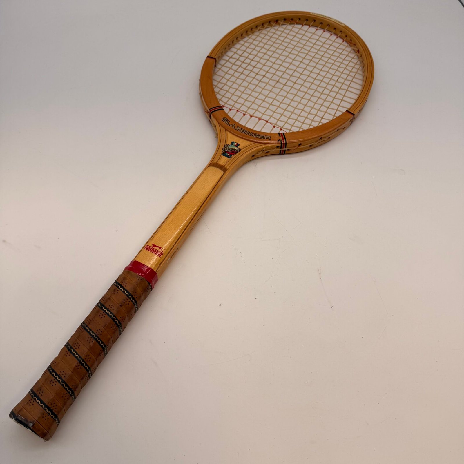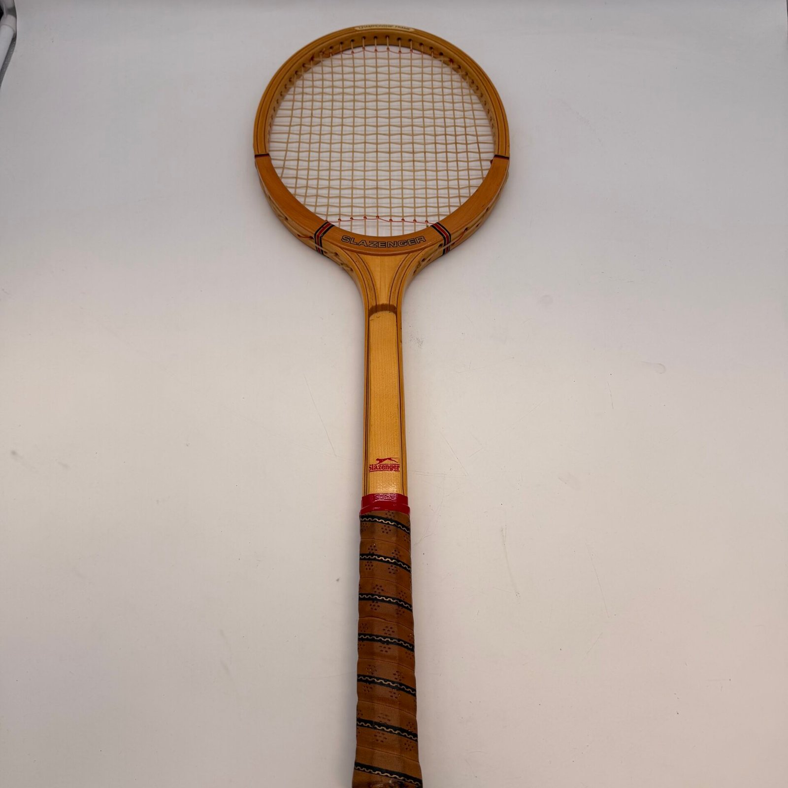 Classic vintage Slazenger wooden tennis racket, Queen’s model, featuring traditional craftsmanship and original details.