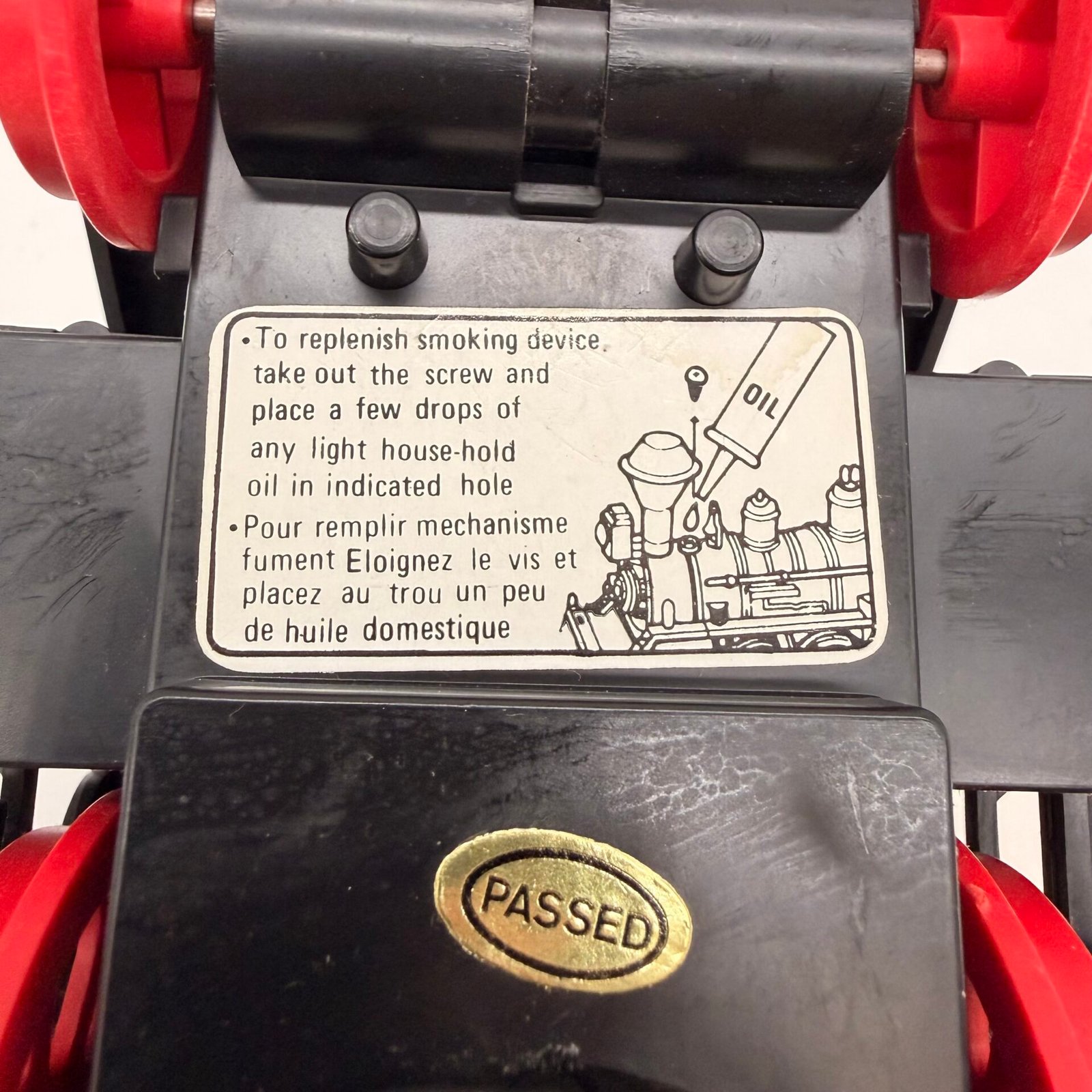 To activate smoke unit, a few drops of light household oil are placed in indicated hole (per original label).