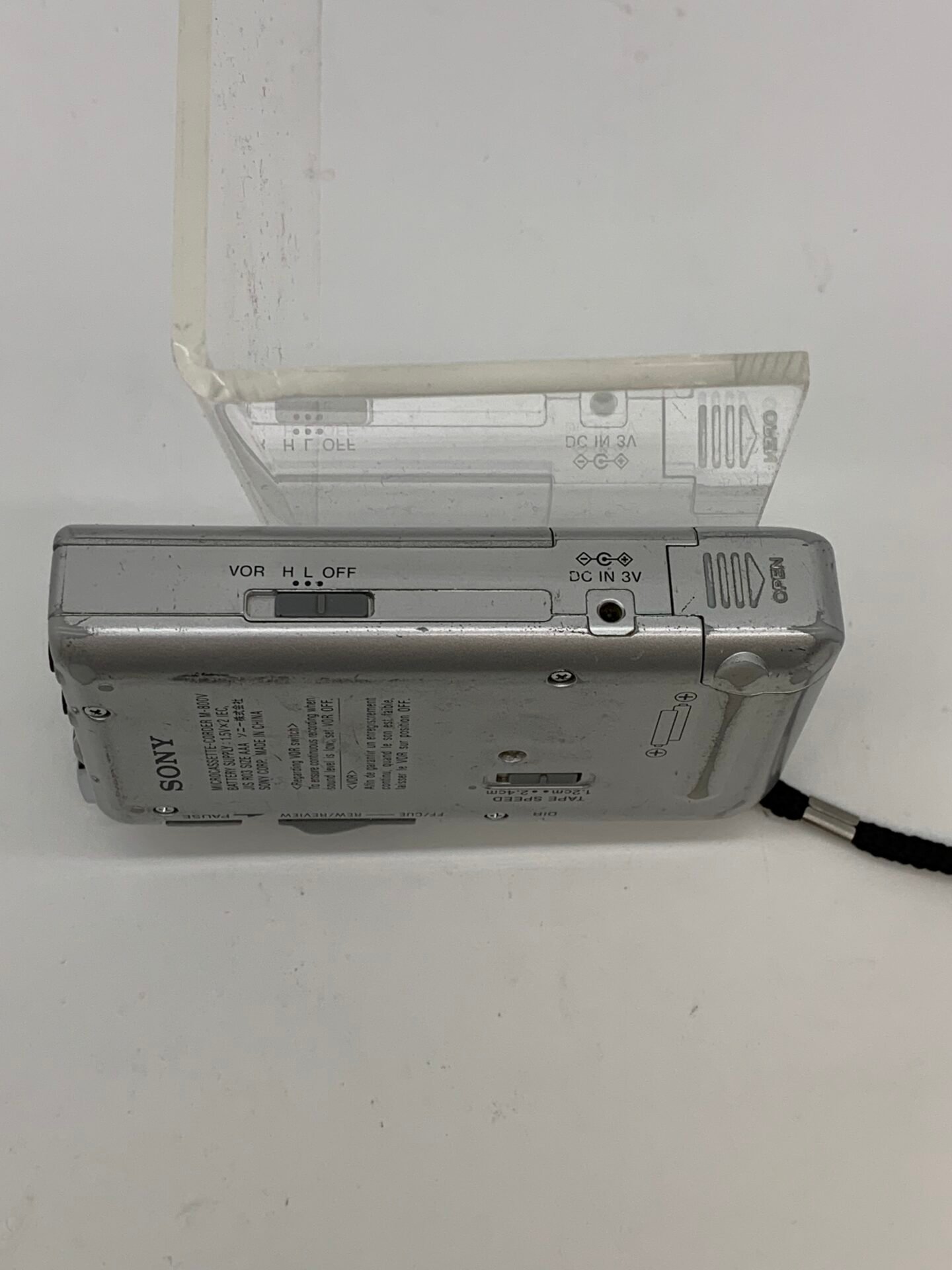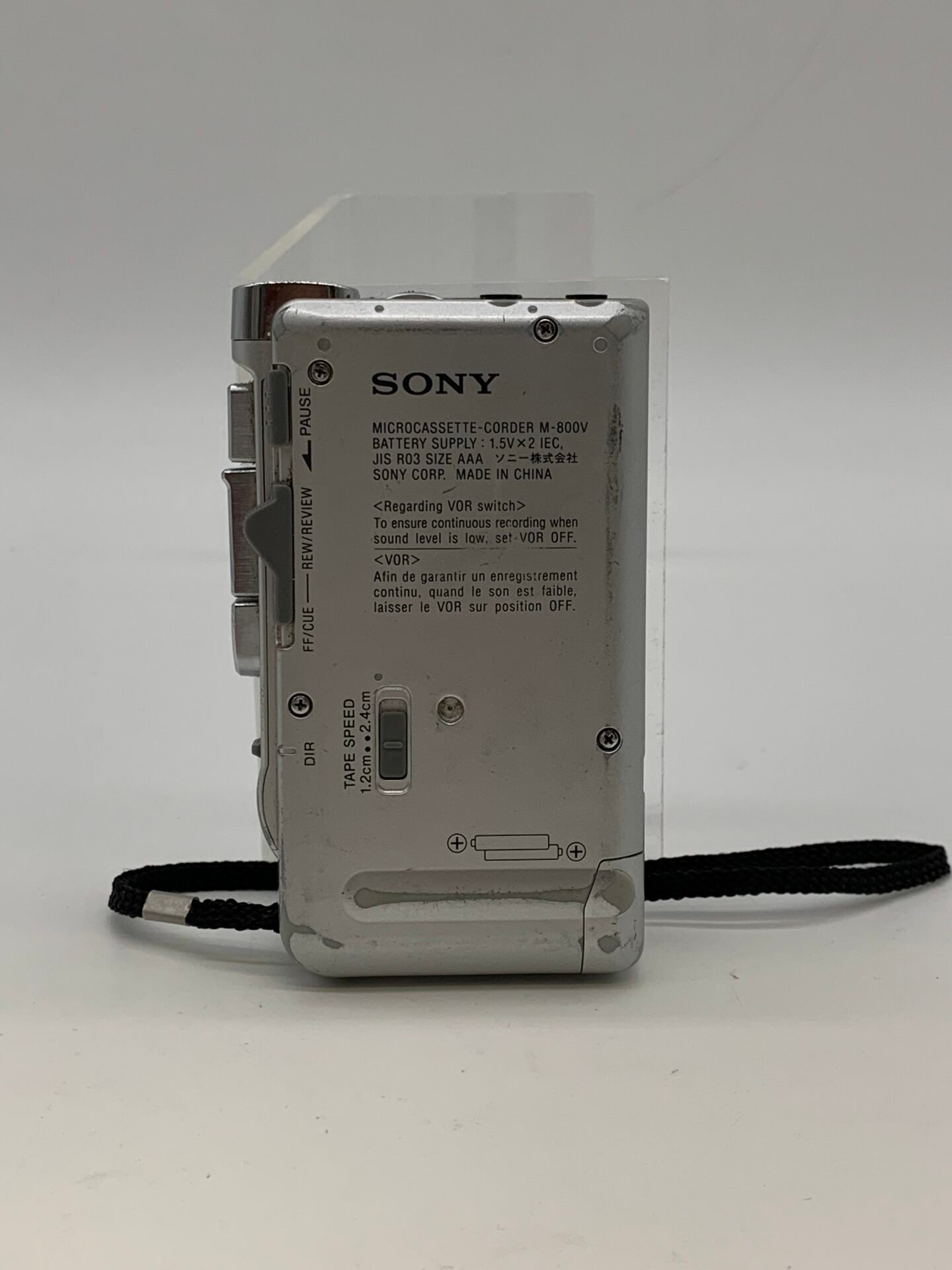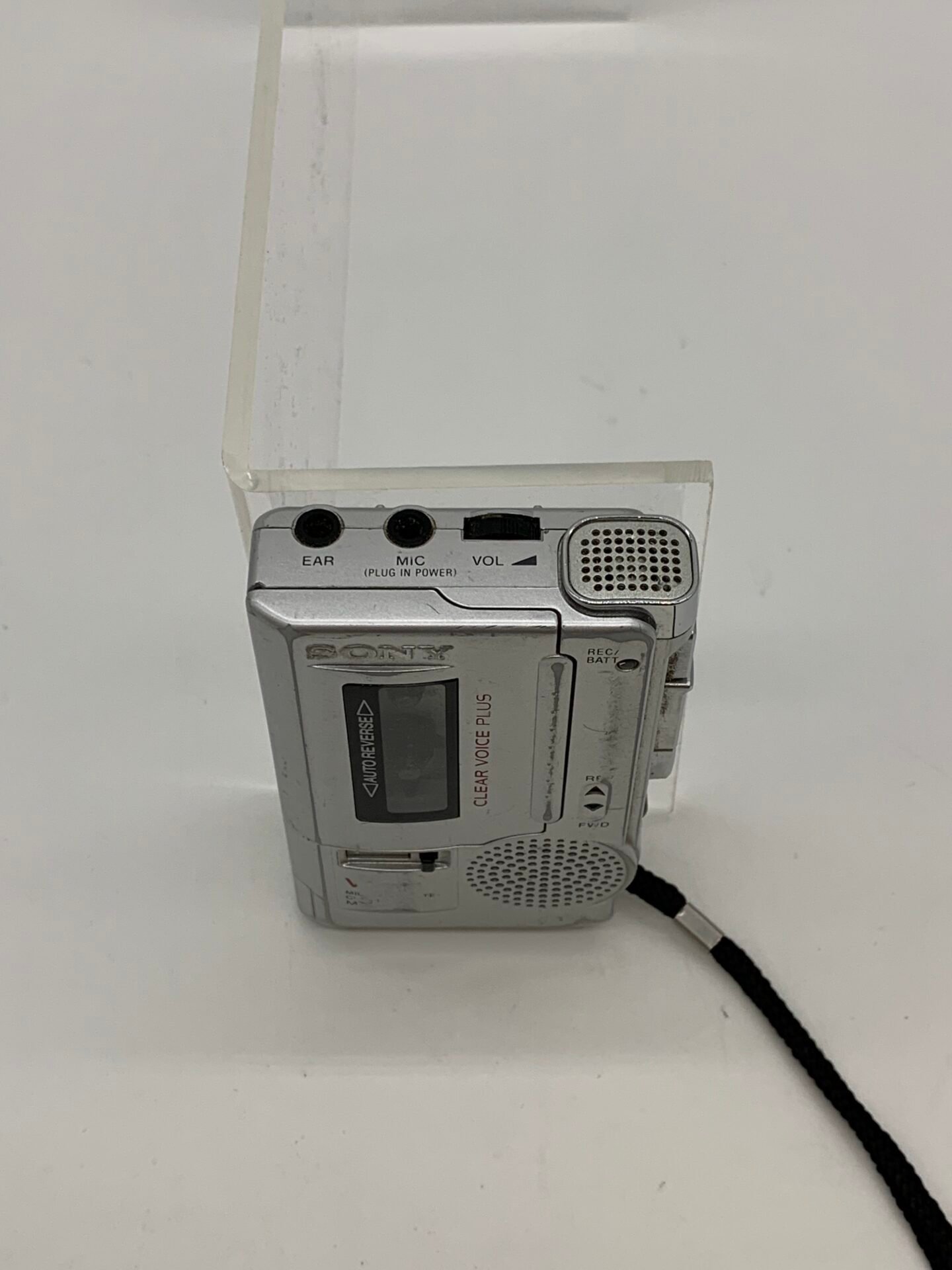 Vintage Sony M-800V Microcassette Recorder featuring Clear Voice Plus technology. A classic portable dictation recorder widely used for interviews, lectures, and professional recordings.