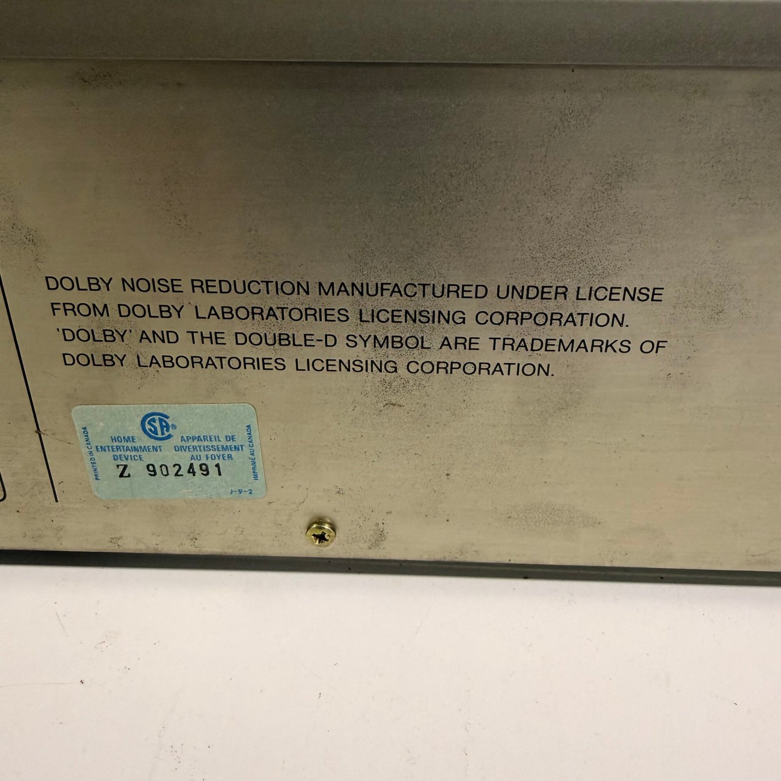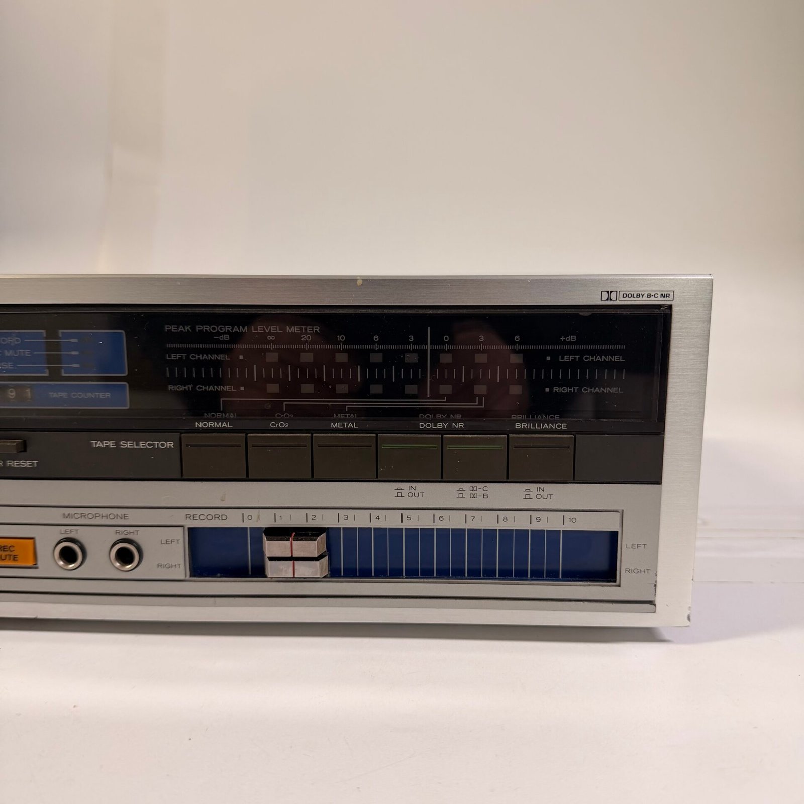 Features Dolby B/C Noise Reduction, peak level meters, microphone inputs, headphone jack, and RCA line input/output.