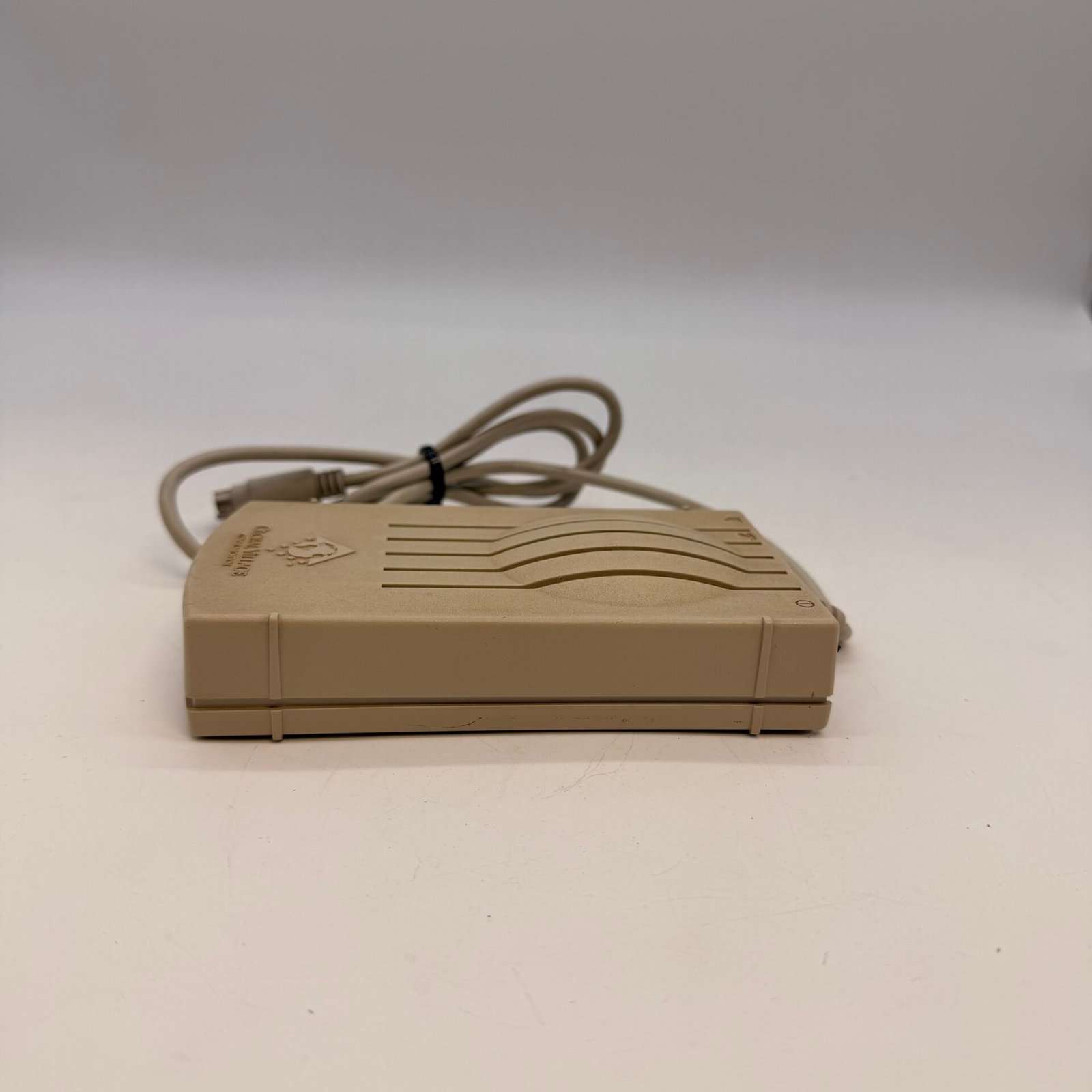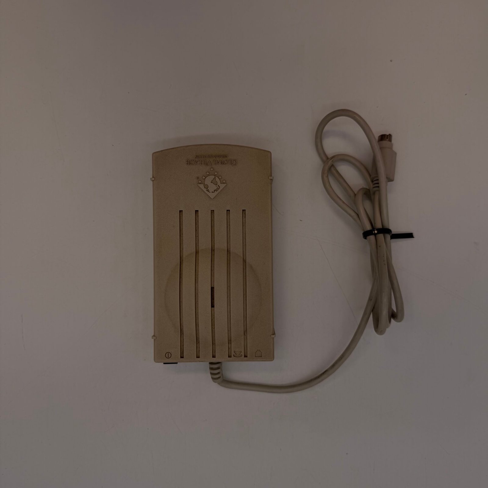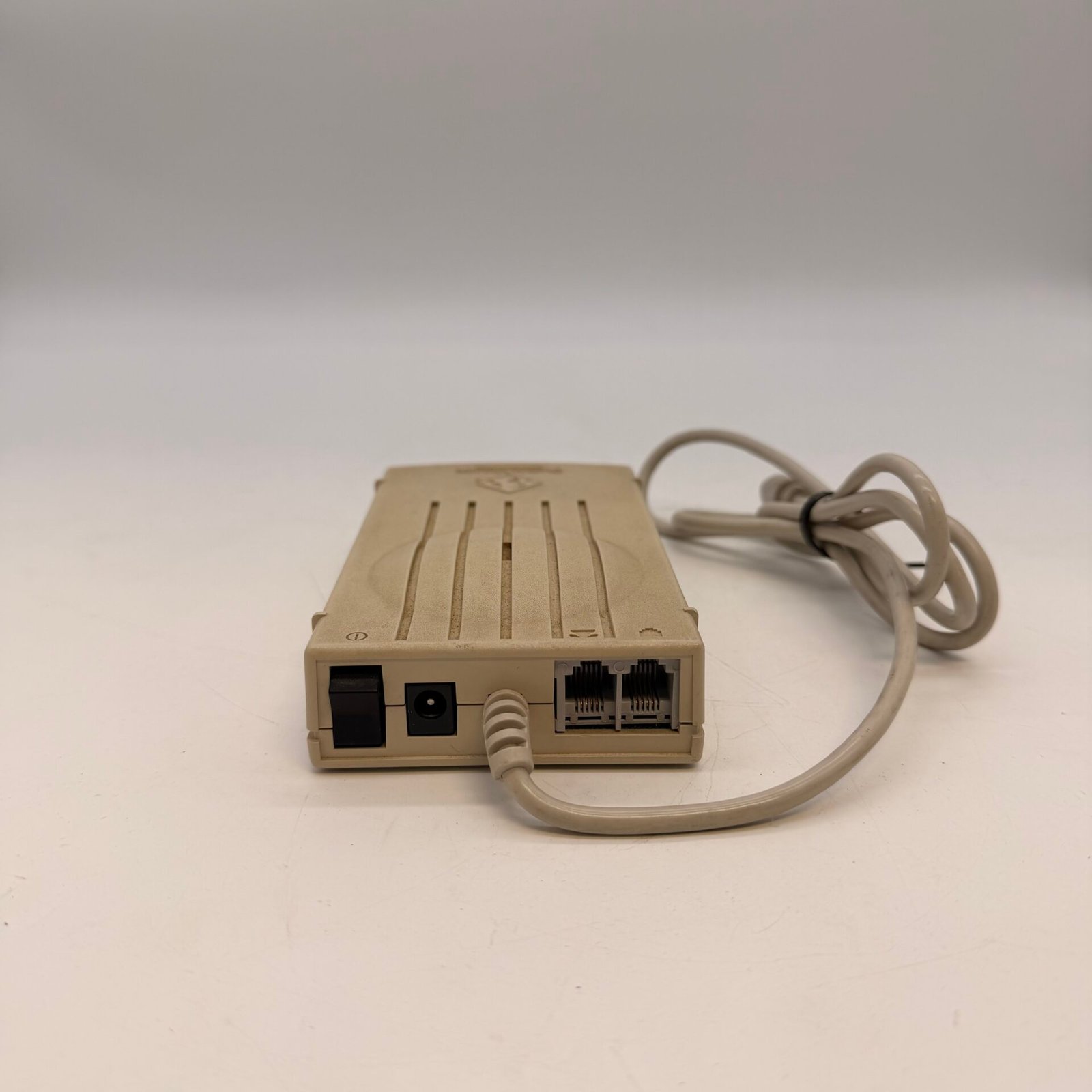 This classic external modem was commonly used with older Macintosh computers for dial-up internet and fax communication in the 1990s.