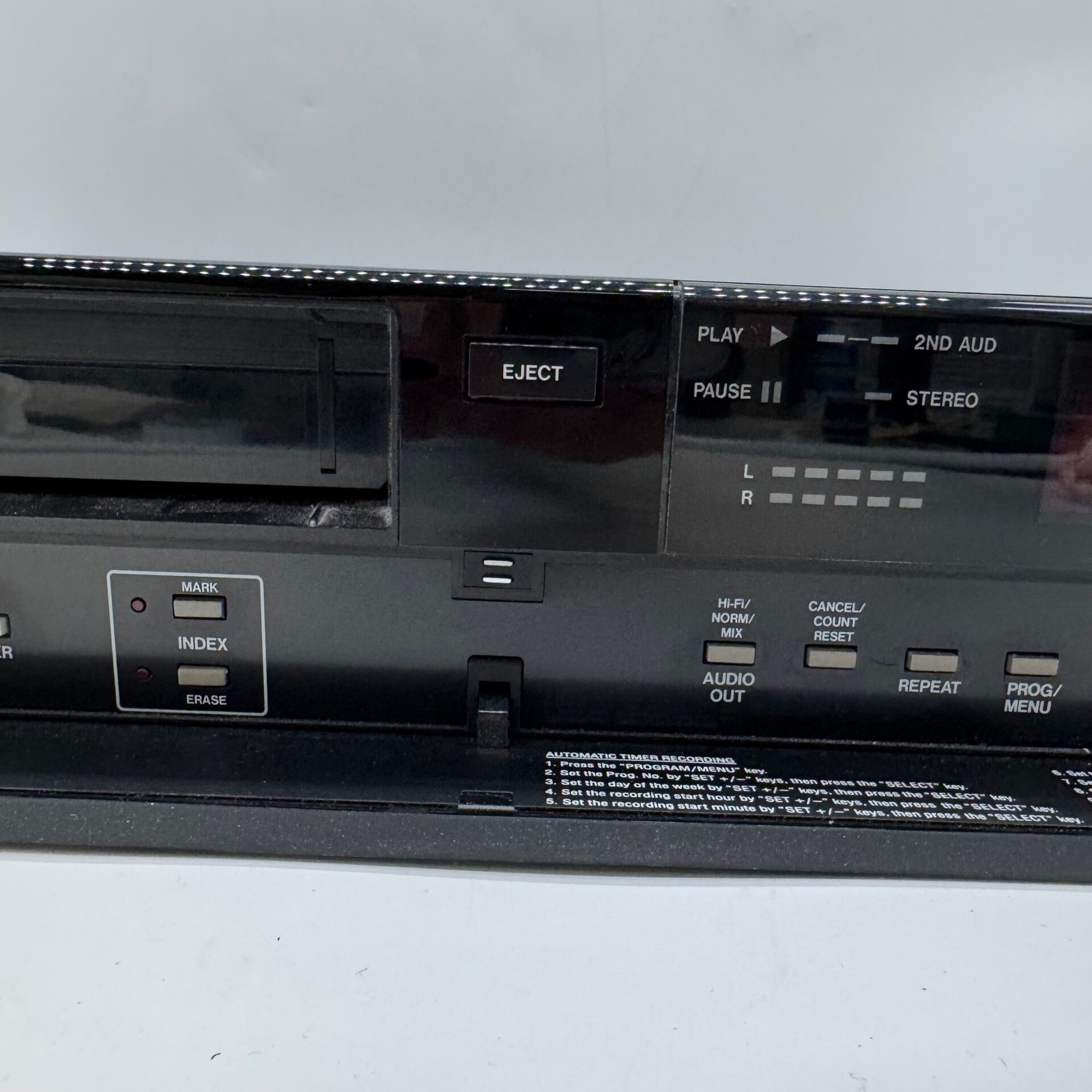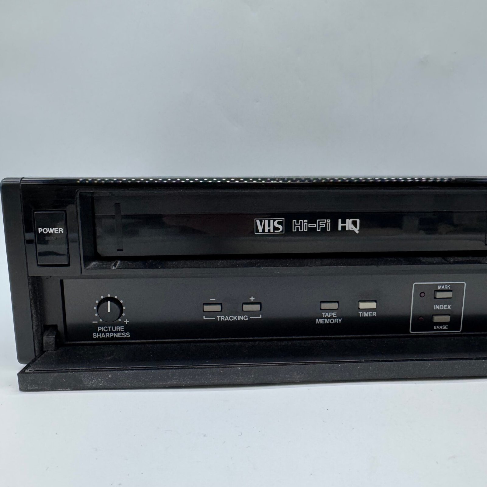 The front panel features tracking control, timer recording functions, and stereo audio output. Perfect for playing or digitizing vintage VHS tapes.