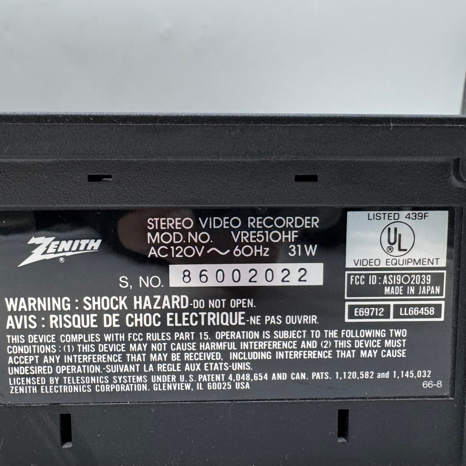 This unit is a Zenith VRE510HF 4-Head Hi-Fi HQ VCR, manufactured in Japan and known for reliable playback and stereo sound quality. The unit powers on and is in very good cosmetic condition with normal light signs of use.