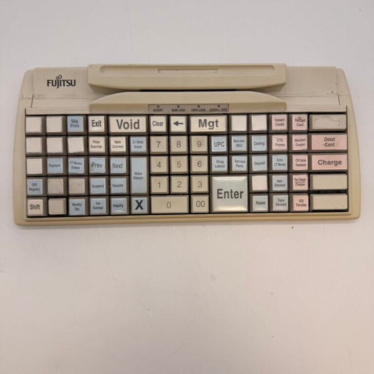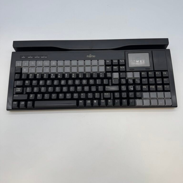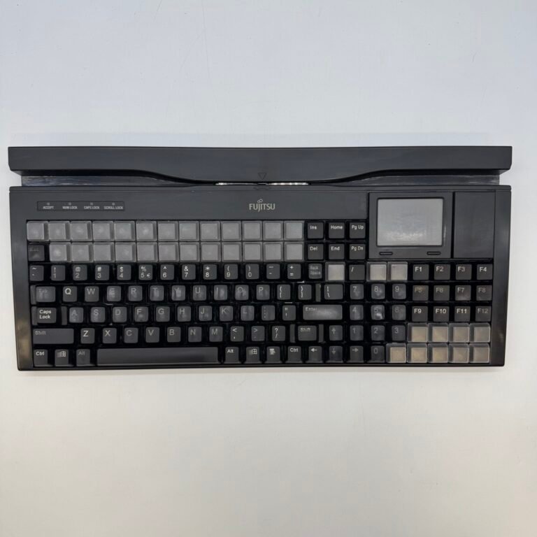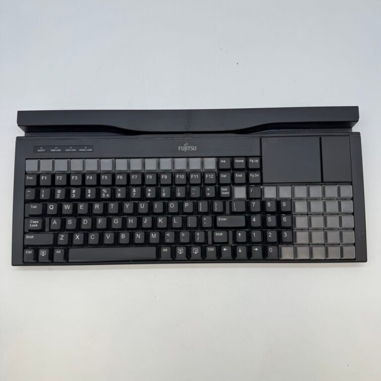 This Fujitsu POS keyboard features a full QWERTY layout along with a large programmable key section for custom functions. Ideal for retail, grocery stores, hospitality, and point-of-sale terminals.