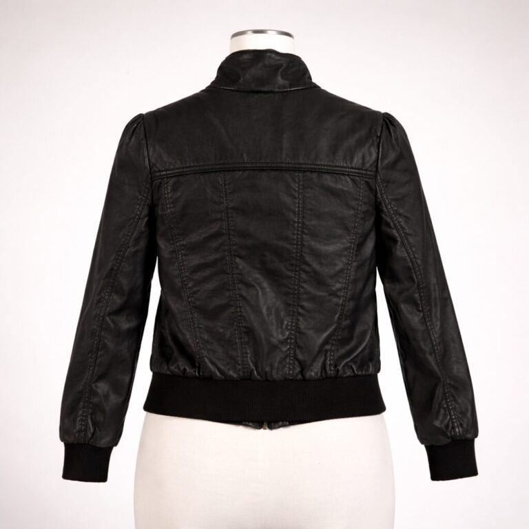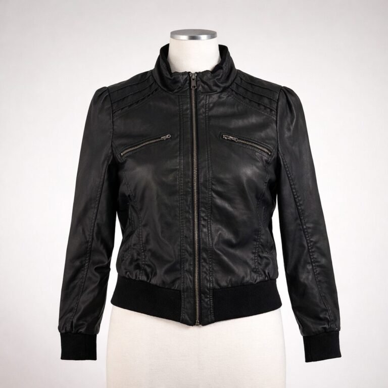 $35.00Stylish black faux leather jacket by Miss London with a sleek biker-inspired design. Features a full zip front, ribbed cuffs and hem, and zippered chest pockets. Great for casual or everyday wear.